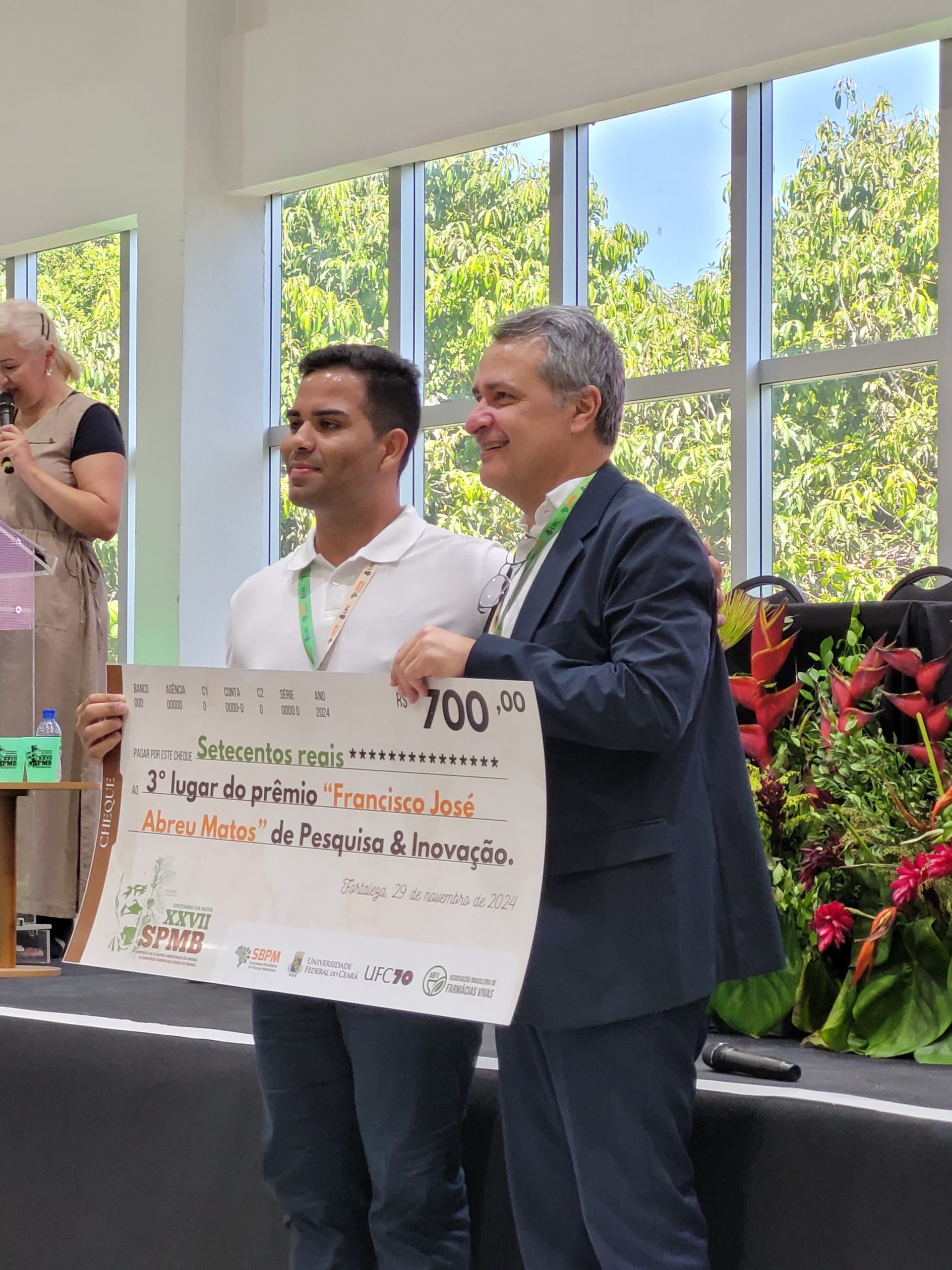 O estudante de doutorado do Programa de Pós-Graduação em Química Victor da Silva Lima recebeu o Prêmio Francisco José de Abreu Matos de Pesquisa & Inovação durante o 27º Simpósio de Plantas Medicinais do Brasil. A edição do evento científico nacional bianual foi realizada na Universidade Federal do Ceará, em Fortaleza, entre os dias 26 e 29 de novembro.