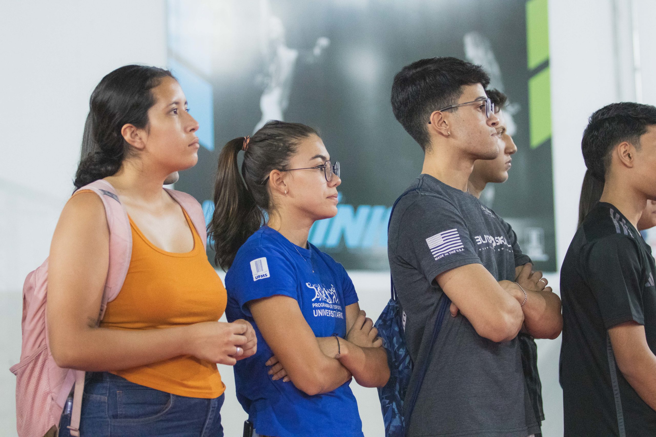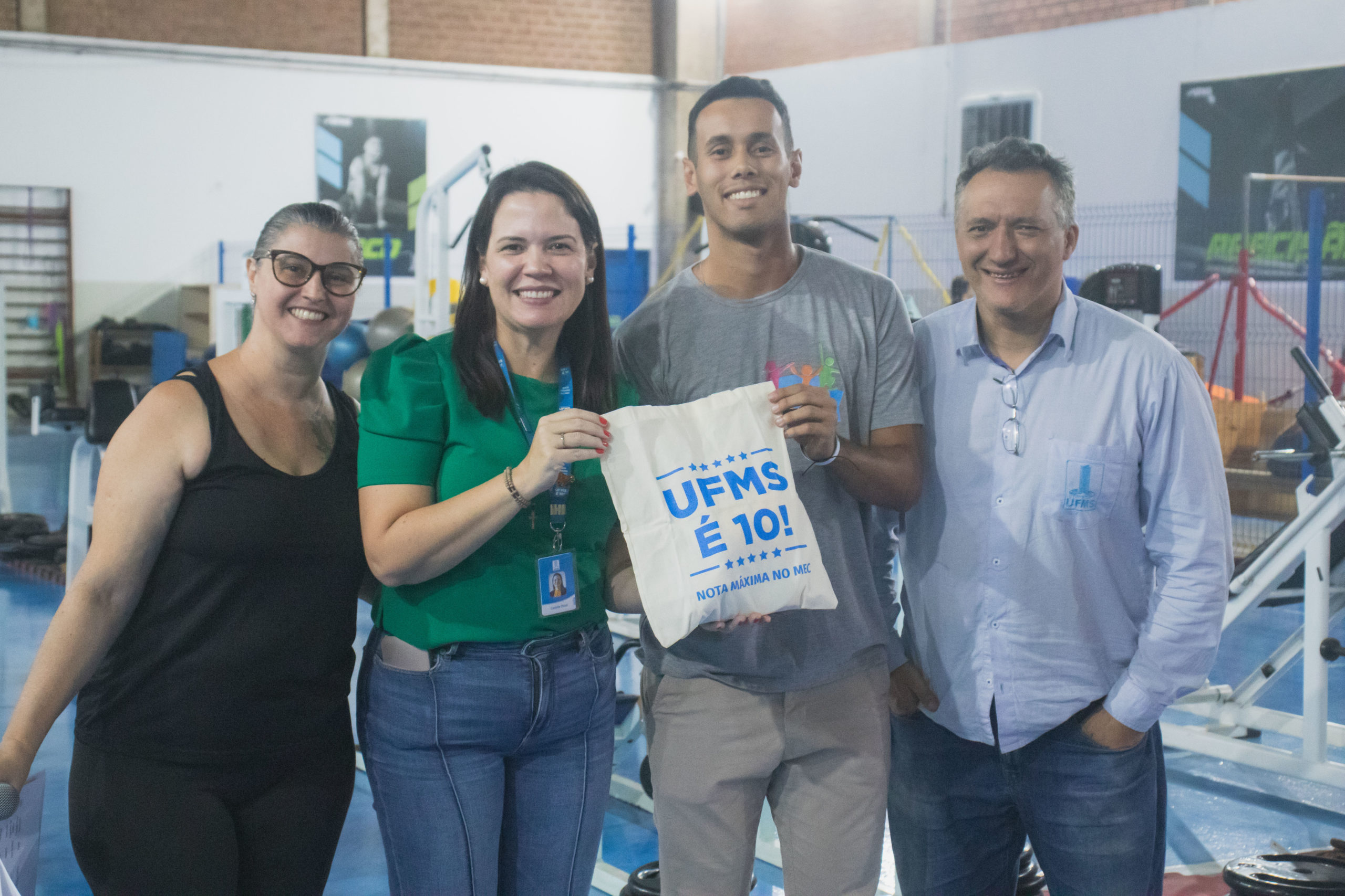 Nesta quinta-feira, 20, foi realizada a cerimônia de entrega de kits com bonés, sacolas e camisetas da Universidade para estudantes integrantes do Programa Bolsa Atleta da UFMS, campeões da seletiva dos Jogos Universitários de Mato Grosso do Sul (Jums) de Praia e para os 13 ingressantes em cursos de graduação por meio do Pró-Atleta, processo seletivo inédito para atletas de alto rendimento esportivo. Neste ano, 25 atletas foram contemplados com bolsas, sendo três estudantes do Câmpus do Pantanal (CPan) e os demais da Cidade Universitária.