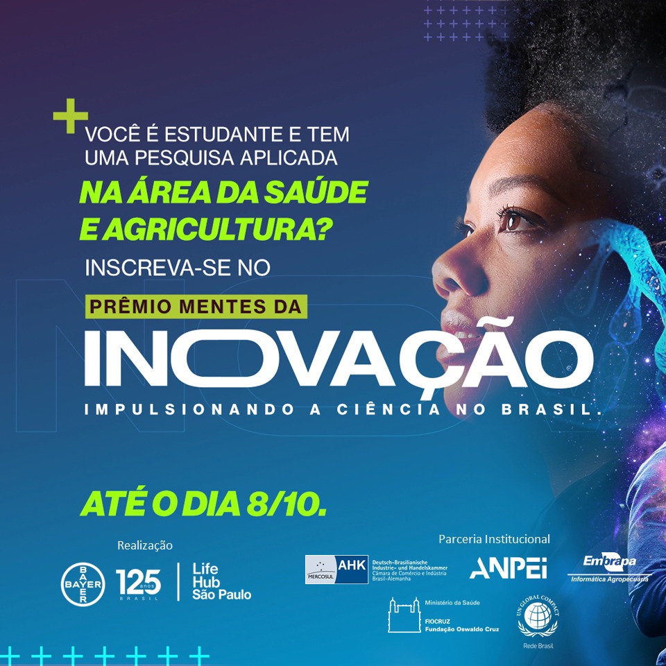 Estão abertas até oito de outubro as inscrições para o prêmio Mentes da Inovação. A iniciativa tem como objetivo impulsionar a ciência no Brasil. Podem participar estudantes pesquisadores com estudos nas áreas da Saúde e Agricultura. A inscrição pode ser feita neste link.