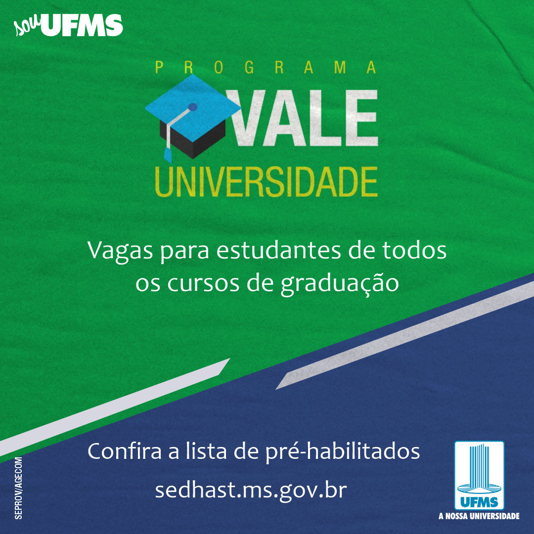 Os estudantes da UFMS que se inscreveram no Vale Universidade já podem conferir se foram selecionados para a próxima fase do programa. A Secretaria de Estado de Direitos Humanos, Assistência Social e Trabalho (Sedhast) publicou a lista de acadêmicos pré-habilitados nesta sexta-feira, 25.