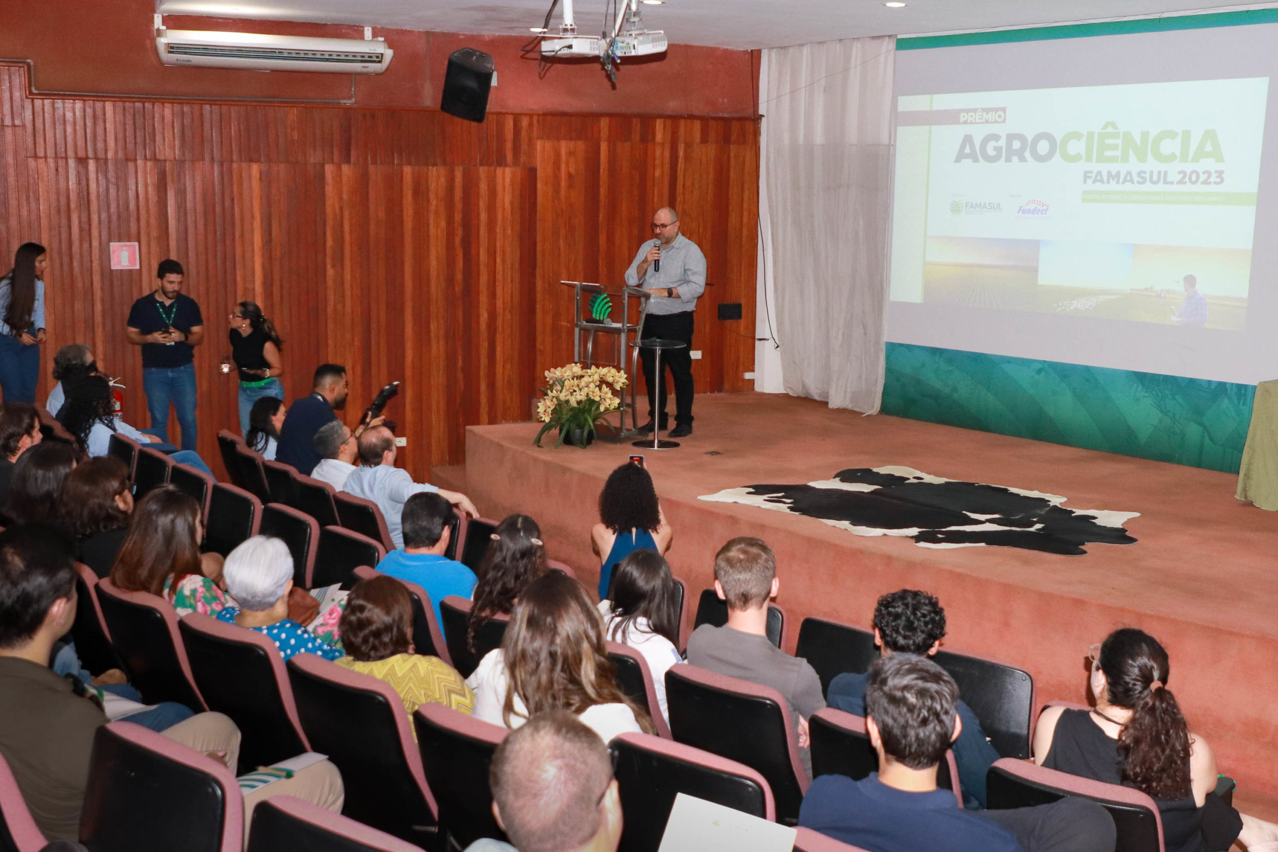 Nessa sexta-feira, 1º, o Sistema Famasul realizou a premiação da 4ª edição do Prêmio AgroCiência. A Universidade foi premiada nas categorias graduação e pós-graduação, com trabalhos dos estudantes da Faculdade de Medicina Veterinária e Zootecnia (Famez) e do Câmpus de Chapadão do Sul (CPCS). O reitor Marcelo Turine participou do evento ao lado do presidente do Sistema Famasul, Marcelo Bertoni, e do diretor-presidente da Fundect, Marcio de Araújo Pereira.