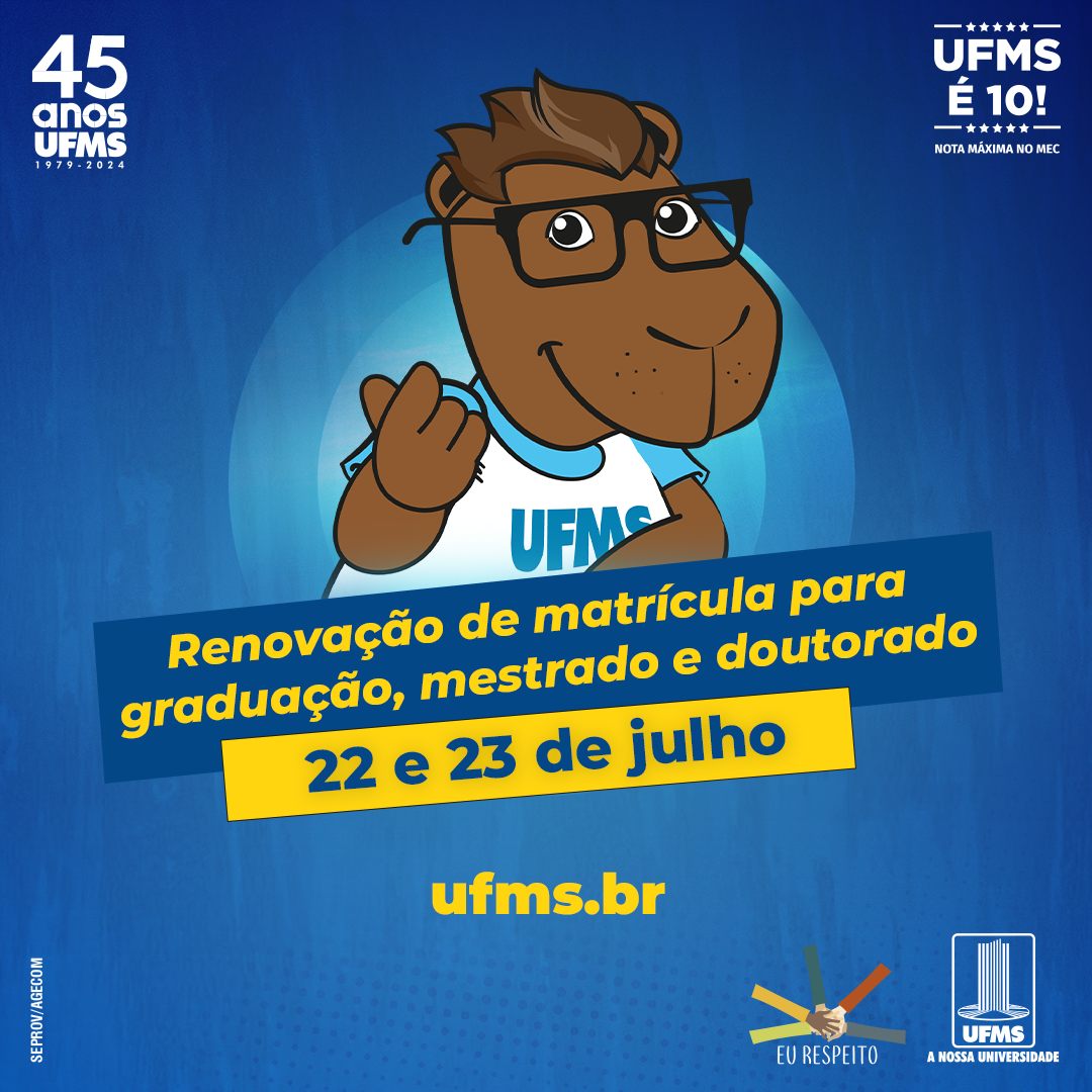 Nesta segunda, 22, e terça-feira, 23, estudantes da graduação e pós-graduação devem renovar suas matrículas na UFMS. O procedimento deve ser feito exclusivamente on-line e o acesso poderá ser por celular, tablet ou computador, com o Passaporte UFMS.