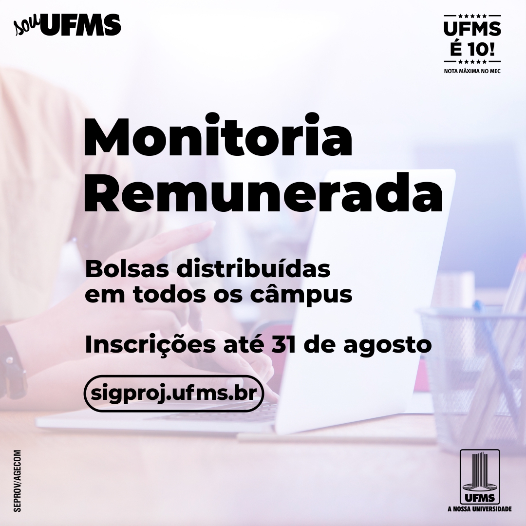 “São bolsas de R$700 para 3 meses de atividades, compreendidos entre setembro e novembro. O Programa Institucional de Monitoria é uma ação de ensino, que contribui para a melhoria da qualidade do ensino e aprendizagem nos cursos de graduação da UFMS, por meio da articulação entre teoria e prática, envolvendo estudantes e professores em atividades didático-pedagógicas”, disse.