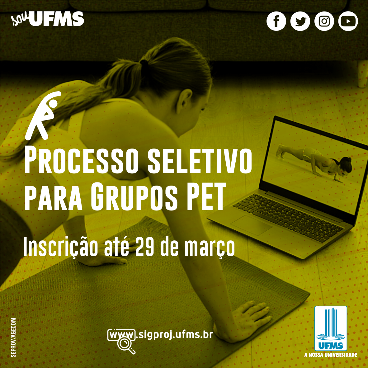 De hoje a 29 de março estão abertas as inscrições para estudantes de graduação integrarem os grupos do Programa de Educação Tutorial (PET) da UFMS. O PET é desenvolvido por grupos de estudantes que, sob tutoria de um professor, realizam atividades orientados pelo princípio da indissociabilidade entre ensino, pesquisa, extensão e educação tutorial.