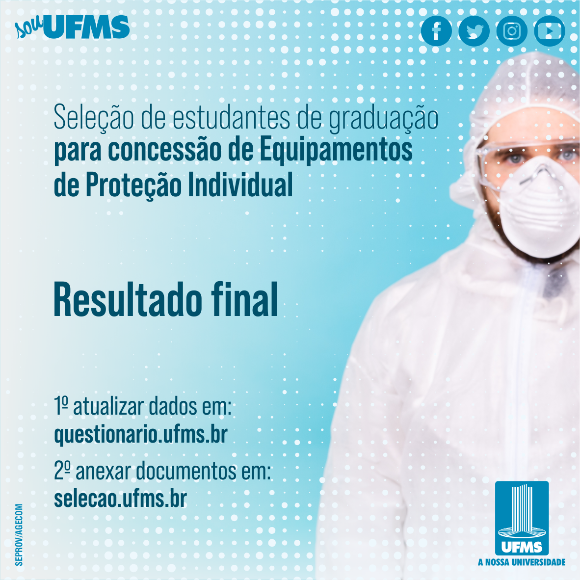 Onze estudantes foram contemplados com o auxílio, estudantes da Cidade Universitária e dos câmpus de Chapadão do Sul, Coxim e Três Lagoas. Entre os equipamentos que serão concedidos estão luvas, jalecos, máscaras específicas, toucas e óculos de proteção.