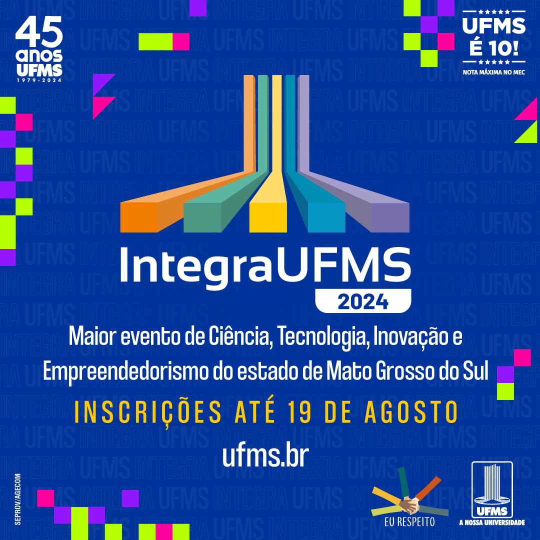 Na próxima segunda-feira, 19, termina o prazo para estudantes de graduação e pós-graduação de todos os câmpus, professores, técnicos e egressos da Universidade realizarem sua inscrição no Integra UFMS 2024. O maior evento científico de Mato Grosso do Sul será realizado entre 21 e 25 de outubro, na Cidade Universitária.