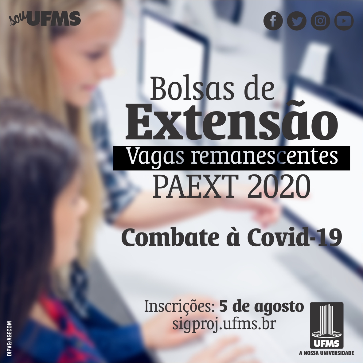No dia 5 de agosto, estudantes de graduação terão mais uma oportunidade de participar do processo seletivo para bolsas de extensão do Paext 2020 e dos projetos e ações de enfrentamento à Covid-19. As inscrições serão aceitas apenas no dia 5 pelo Sigproj.