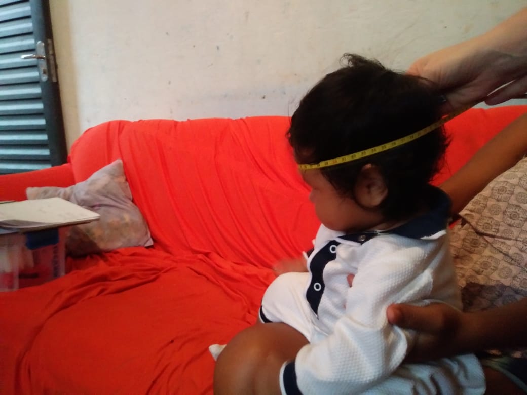 Aos seis, assim como aos doze meses, mães e bebês realizam na visita exame de hemoglobina, com coleta de sangue capilar e dosagem sanguínea para verificação de anemia, além da antropometria de mãe e filho.