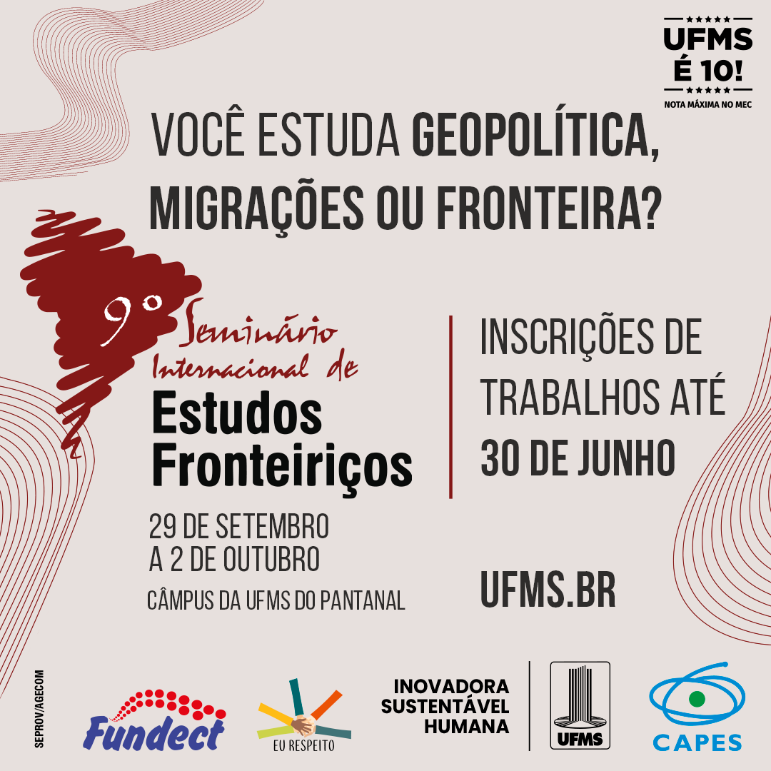 A 9ª edição do Seminário Internacional de Estudos Fronteiriços será realizada de 29 de setembro a 2 de outubro no Câmpus da UFMS do Pantanal (CPan). Pesquisadores interessados em apresentar trabalhos têm até 30 de junho para inscrição e envio de propostas na página do evento. A participação como ouvinte é aberta a toda a comunidade e a inscrição está prevista para agosto.