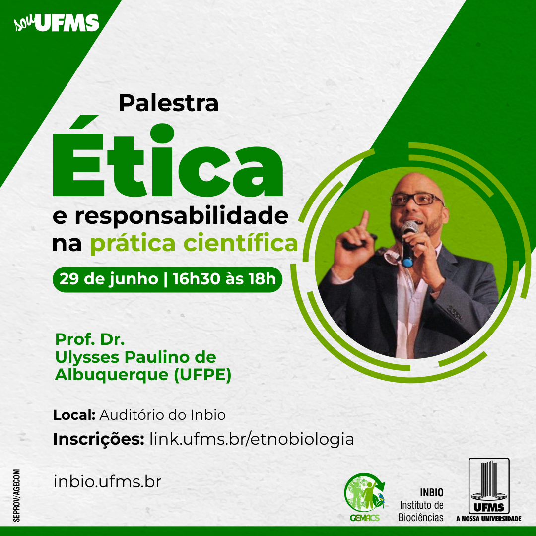 Nesta quinta-feira, 29, pesquisadores e estudantes de graduação e pós-graduação têm a chance de participar de palestra para discutir aspectos éticos na pesquisa científica. O evento é realizado pelo Grupo de Estudos Multidisciplinares: aspectos ambientais, culturais e socioeconômicos e Laboratório de Etnobotânica, ambos vinculados ao Instituto de Biociências (Inbio) da UFMS.