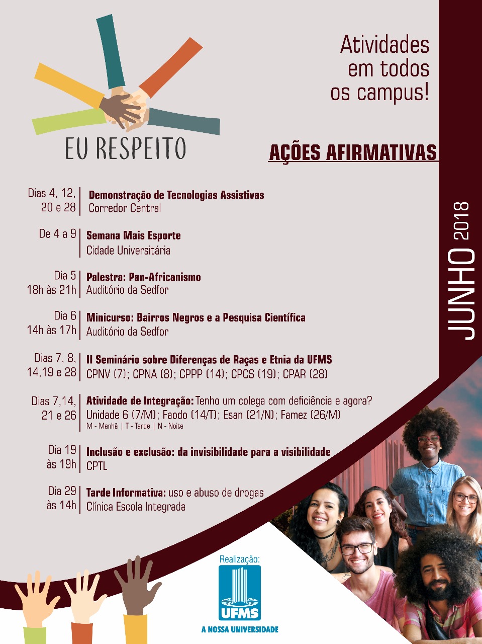 A campanha Eu Respeito do mês de junho tem como tema as Ações Afirmativas, que garantem igualdade em oposição à discriminação. O objetivo da campanha é promover o respeito entre a comunidade acadêmica, como um valor que deve ser colocado em prática nas interações do dia a dia.