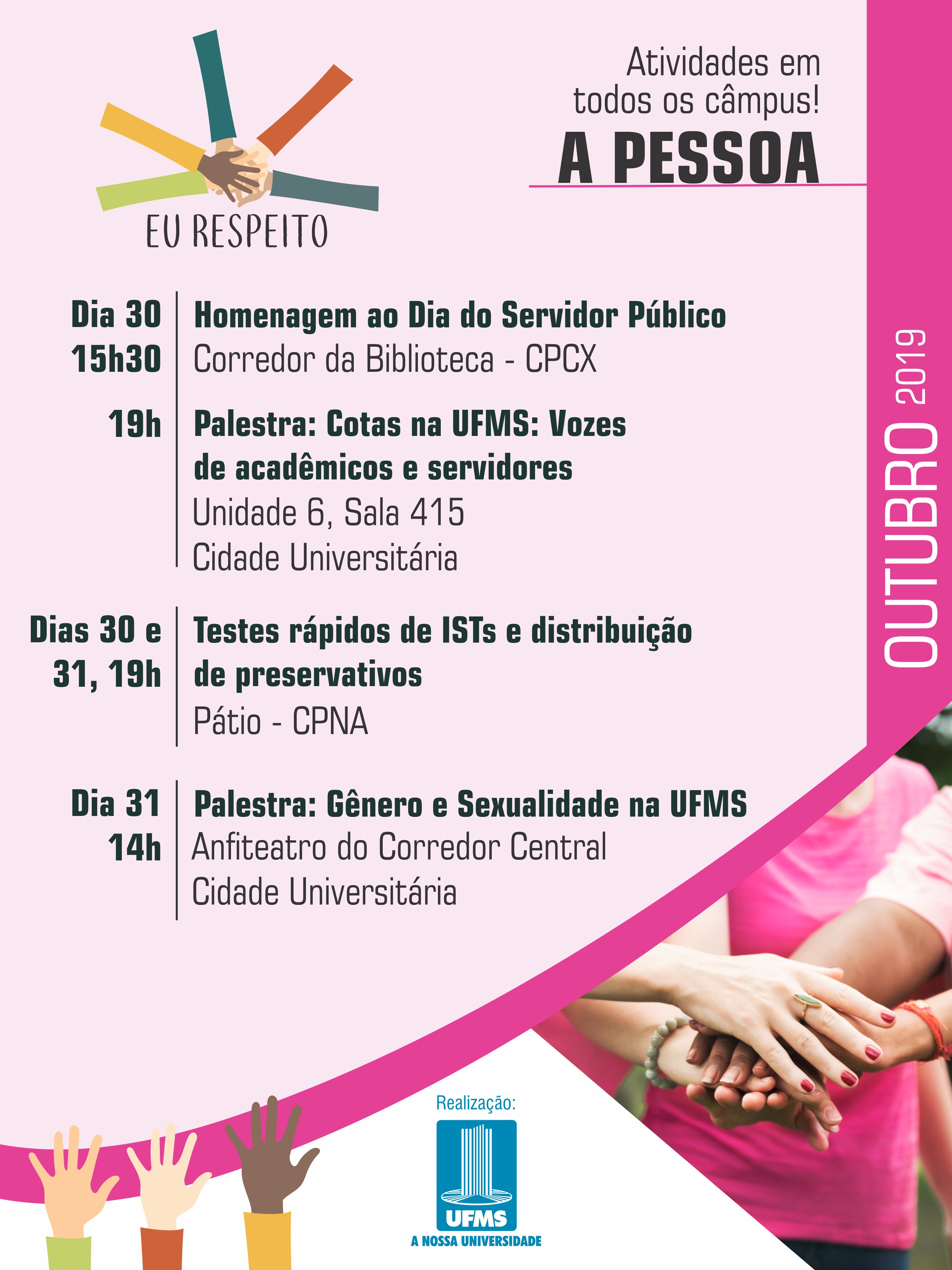 No mês de outubro a campanha institucional Eu Respeito trabalha o tema “a pessoa”. As atividades desenvolvidas hoje (30) têm o objetivo de informar a comunidade acadêmica em relação às cotas na universidade e à saúde sexual, por meio de palestras e testes rápidos. Além disso, no mês em que é promovido nacionalmente o “Outubro Rosa”, a Universidade busca conscientizar e alertar as mulheres e a sociedade sobre a prevenção e diagnóstico precoce do câncer de mama.