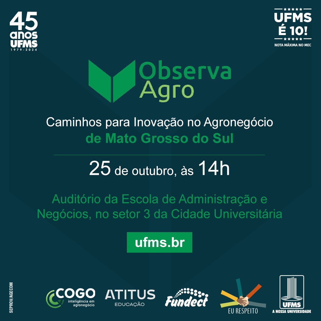 No dia 25 de outubro, a Universidade promove o evento Observa Agro – Caminhos para Inovação no Agronegócio de Mato Grosso do Sul. Realizado pela primeira vez no Estado, a atividade será no auditório da Escola de Administração e Negócios (Esan), no setor 3 da Cidade Universitária, às 14h. A ação é aberta à comunidade universitária e externa, sem necessidade de inscrição prévia.