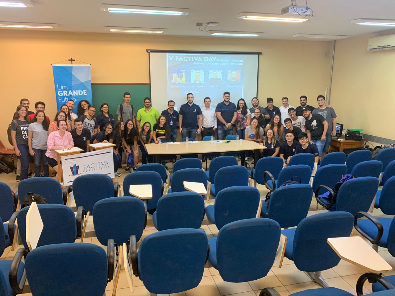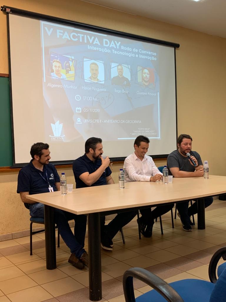 Na tarde de ontem (5), foi realizada a quinta edição do “Factiva Day”, evento organizado pela Factiva, empresa júnior do curso de Engenharia de Produção, que realiza ações no Campus de Três Lagoas desde 2012. O evento, com a temática voltada para a interação entre tecnologia e inovação, contou com a participação de Algemiro Munhoz, analista de mercado no Senai/MS, Tiago Braz, gerente de planta da Amcor, Heron Nogueira, supervisor de manutenção da Amcor e Gustavo Amaral, fundador da Appedidos.