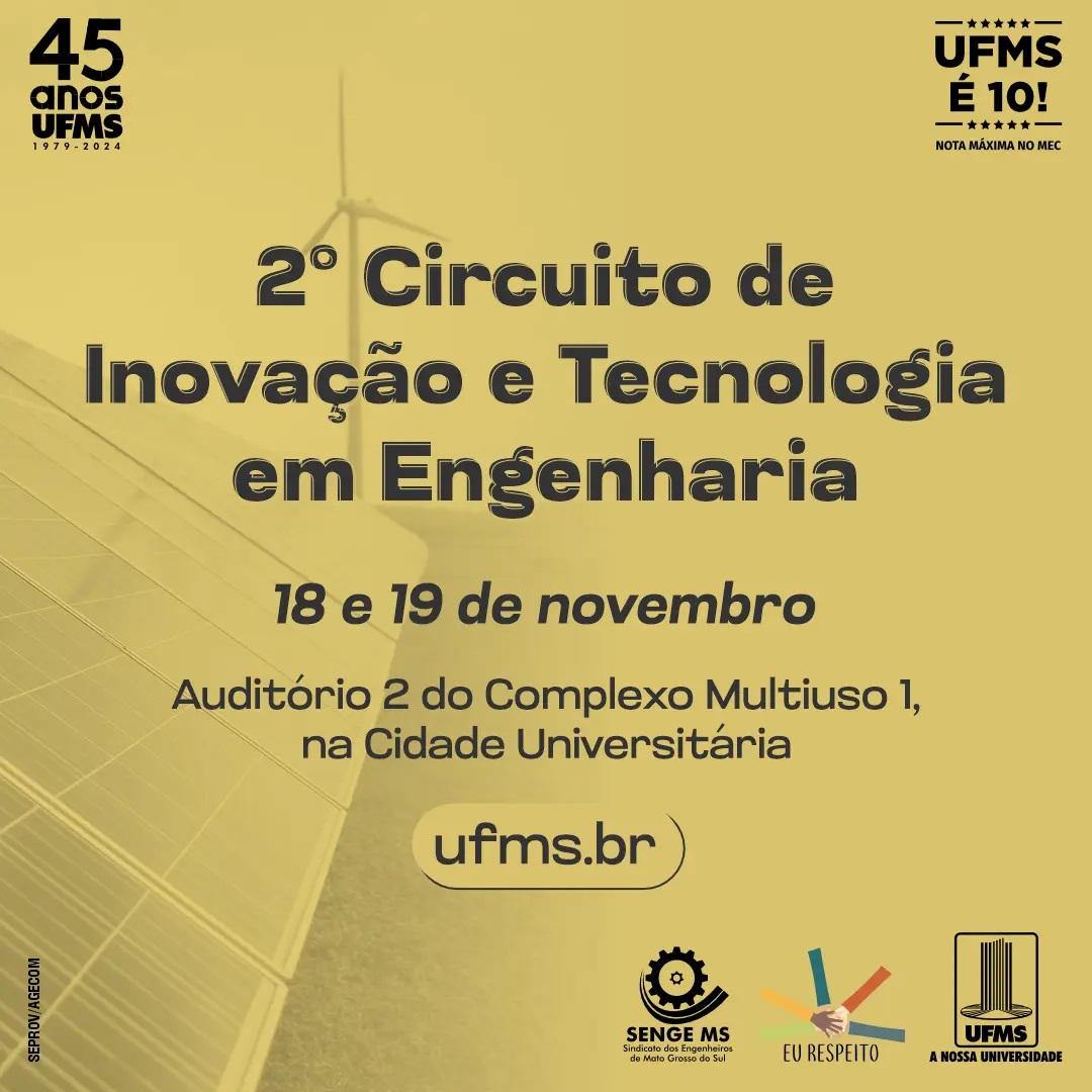 Nos dias 18 e 19 de novembro, a Universidade, em parceria com o Sindicato dos Engenheiros de Mato Grosso do Sul, promove o 2º Circuito de Inovação e Tecnologia em Engenharia (Cinoteng). A realização será no auditório 2 do Complexo Multiuso 1, na Cidade Universitária. O evento é gratuito e aberto a toda a comunidade e as inscrições podem ser feitas nesta página.