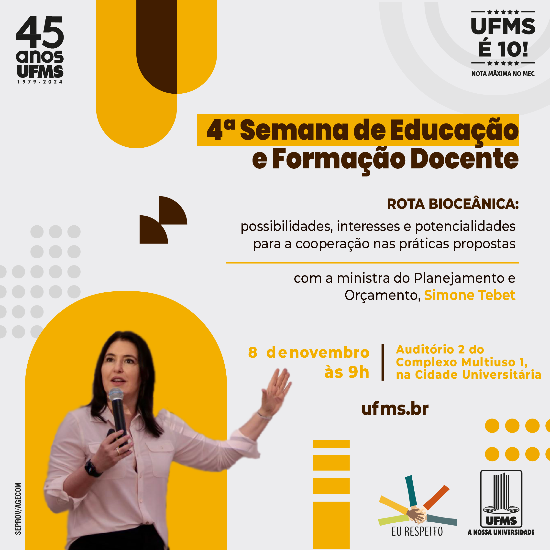 Na programação estão palestras, rodas de conversa, oficinas, exposição e grupos temáticos, entre outras atividades. No dia 8, a partir das 9h, a ministra do Planejamento e Orçamento, Simone Tebet, realiza a conferência Rota Bioceânica: possibilidades, interesses e potencialidades para a cooperação nas práticas propostas. A atividade será no auditório 2 do Complexo Multiuso 1, com representantes da UFMS, Argentina, Chile e Paraguai e mediação da professora da Faed, Maurinice Evaristo Wenceslau.
