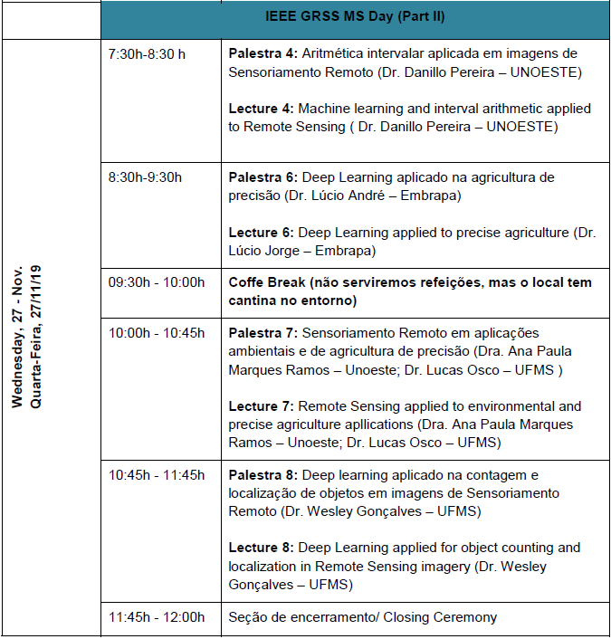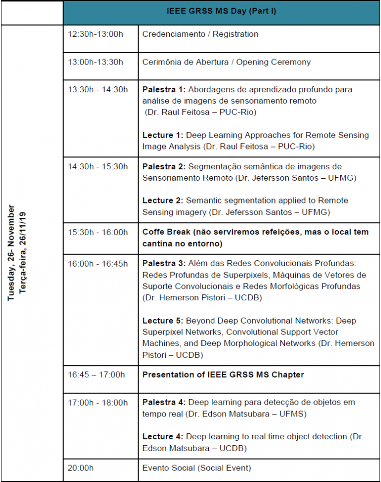 As inscrições para o evento Mato Grosso do Sul Day com o tema “Deep Learning for Earth Observation Applications” estão abertas até 27 de novembro (quarta-feira), são gratuitas e abertas ao público em geral. Serão oito palestras oferecidas, entre hoje (26/11) e 27 de novembro, por professores e pesquisadores do Brasil inteiro, além de eventos sociais e coffee break.