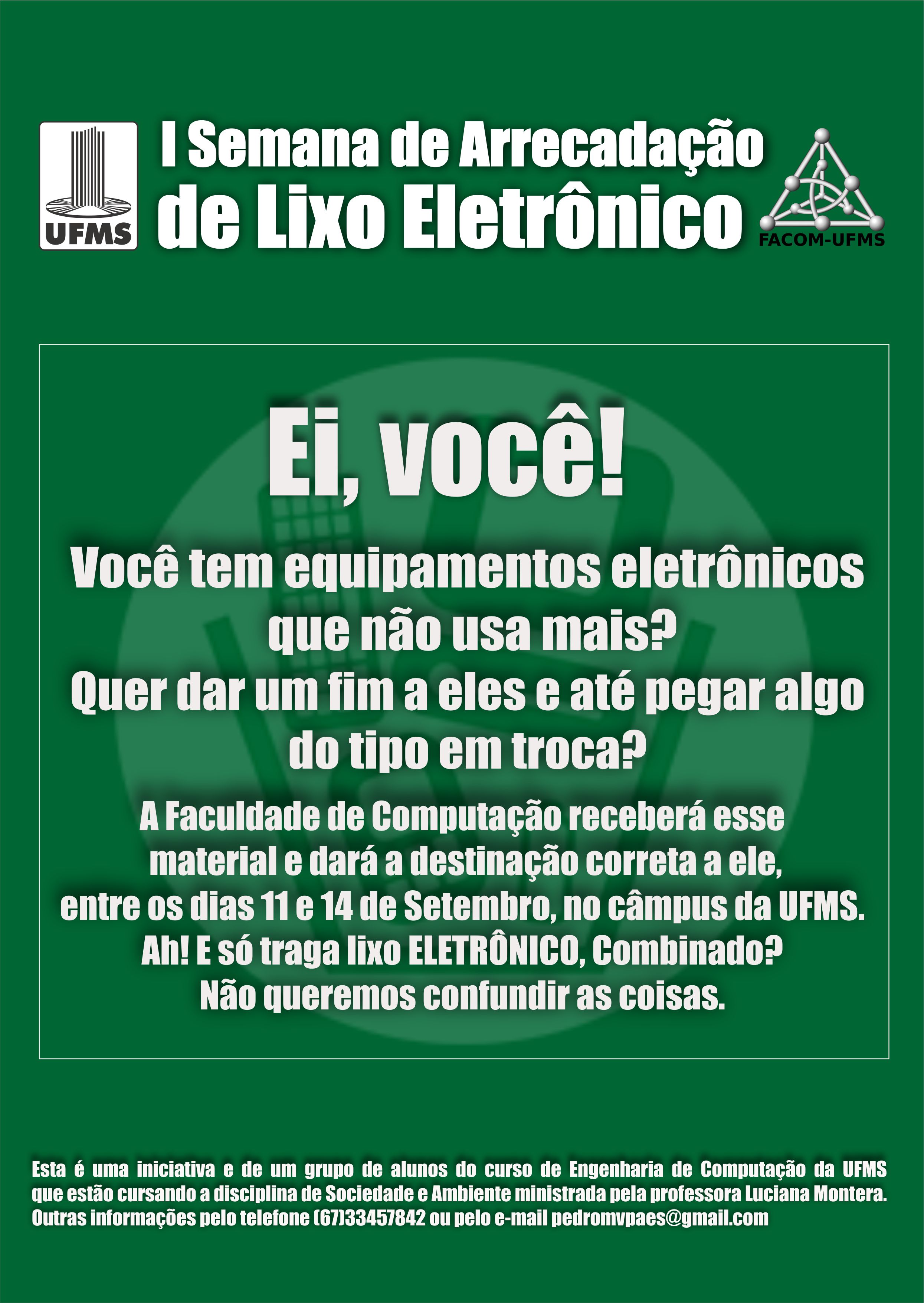 Alunos do curso de Engenharia de Computação, da Facom, realizam, de 11 a 14 de setembro, a  I Semana de Arrecadação de Lixo Eletrônico.
