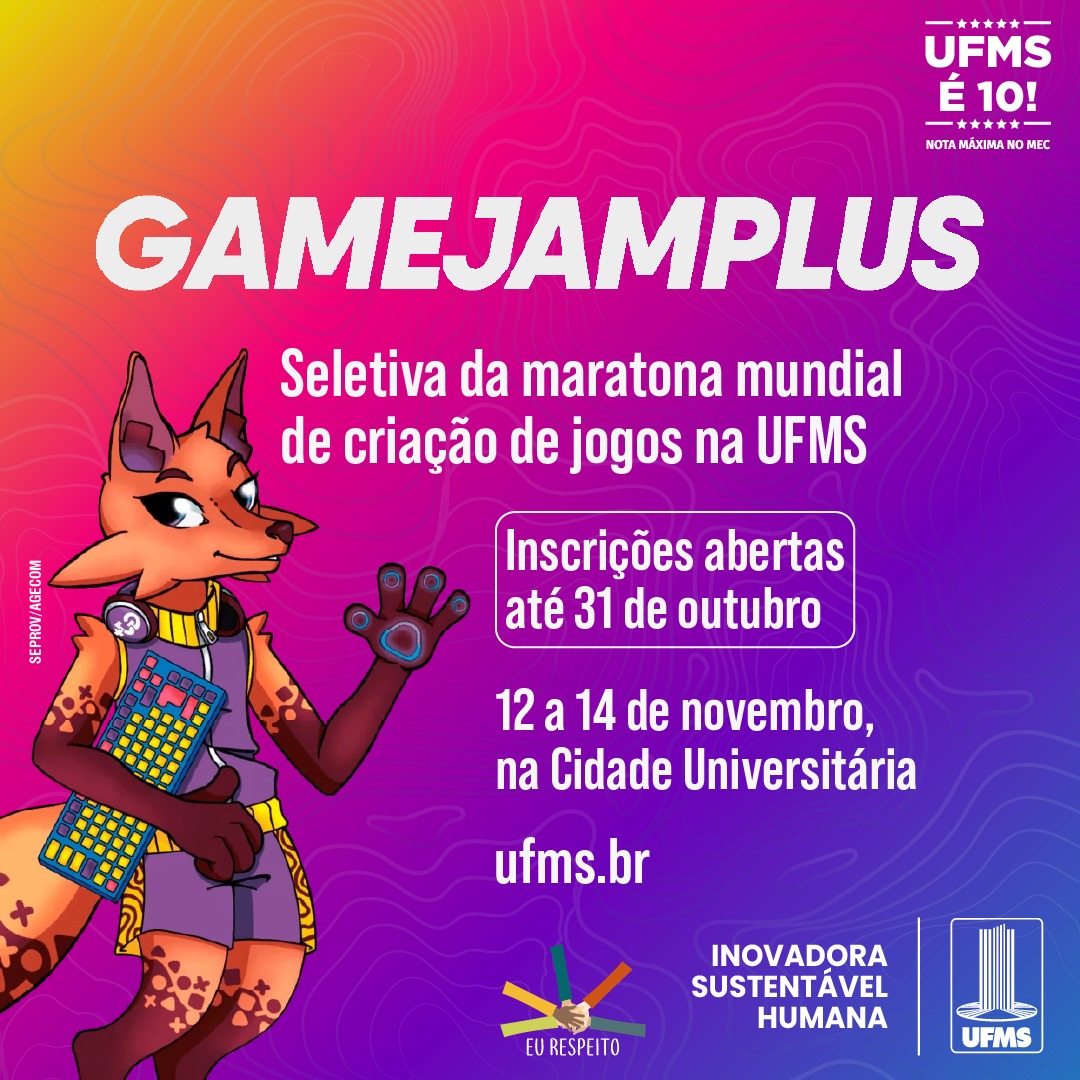 Entre os dias 12 e 14 de novembro, a Faculdade de Computação (Facom) sedia seletiva da maratona mundial de criação de jogos GameJamPlus (GJ+). As inscrições para participar já estão abertas e seguem até 31 de outubro. É necessário acessar a plataforma da competição, fazer o cadastro e escolher a UFMS como sede. Em seguida, os participantes devem preencher formulário e ler o Guia de Sobrevivência do Jammer.