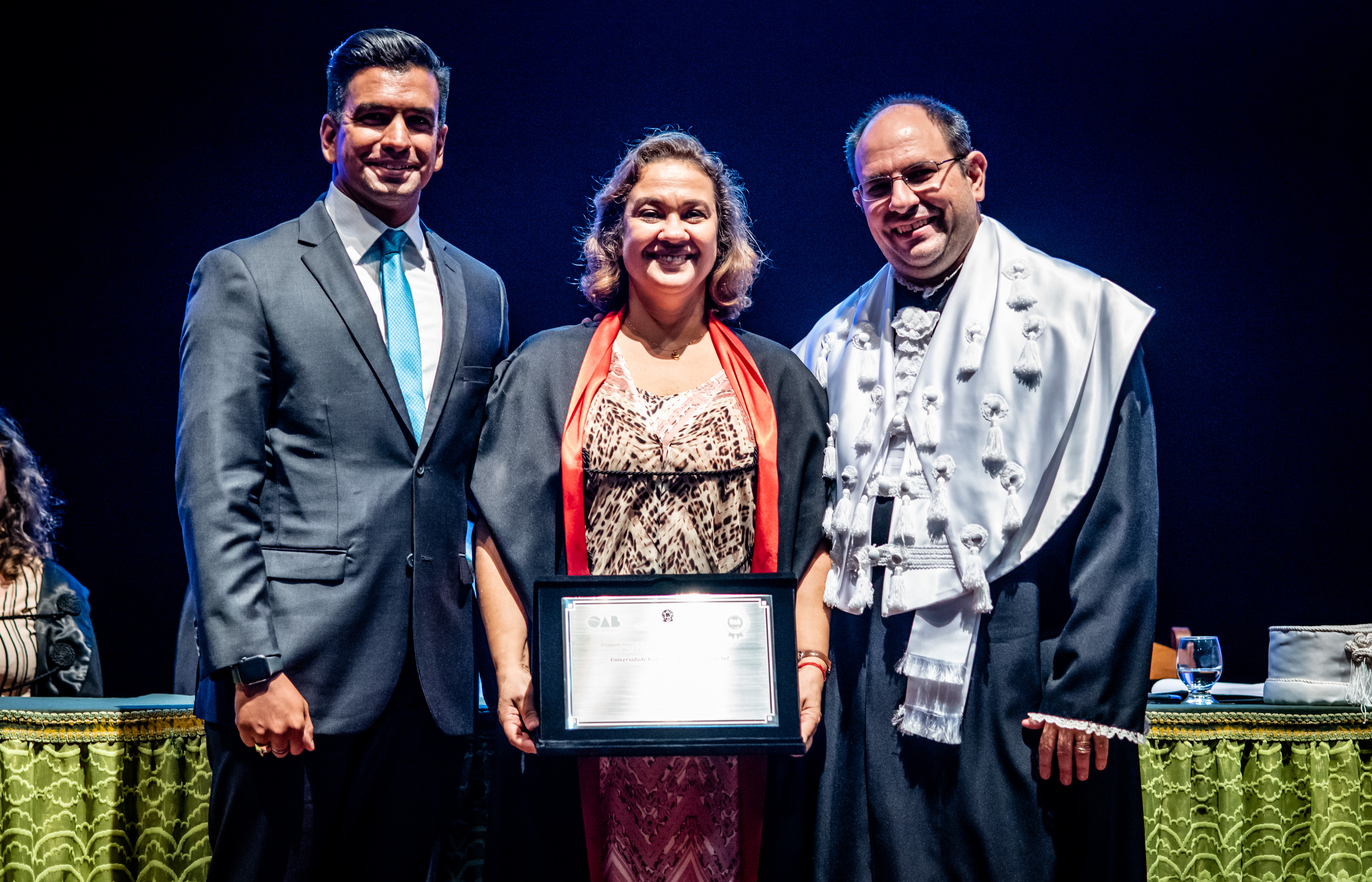 Durante a celebração oficial da colação de grau dos formandos do curso de Direito, na quarta-feira, dia 6, os alunos tiveram mais um motivo para comemorar. O reitor Marcelo Turine e o advogado Rodrigo Correa do Couto, representante da OAB-MS, repassaram à diretora Ynes da Silva Félix a placa do Selo de Qualidade OAB Recomenda. O prêmio foi entregue ao reitor no último dia 30 de janeiro, em Brasília, e é concedido pela Ordem dos Advogados do Brasil aos cursos que têm desempenho de excelência na formação de jovens advogados do país e expressa o reconhecimento pelo elevado padrão dos cursos de Direito da Instituição.