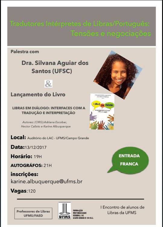 Após a palestra, será lançado o livro: Libras em diálogo: Interfaces com a tradução e interpretação, dos autores: Adriana Escobar, Hector Calixto e Karine Albuquerque.