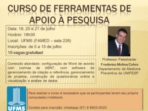 Será realizado de 19 a 21 de julho o Curso de Ferramentas de Apoio à Pesquisa que tem como público alvo acadêmicos do curso de Medicina, pós-graduandos das áreas da saúde e candidatos à pós-graduação nessas áreas.
