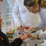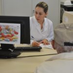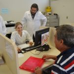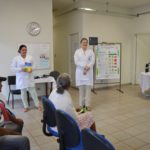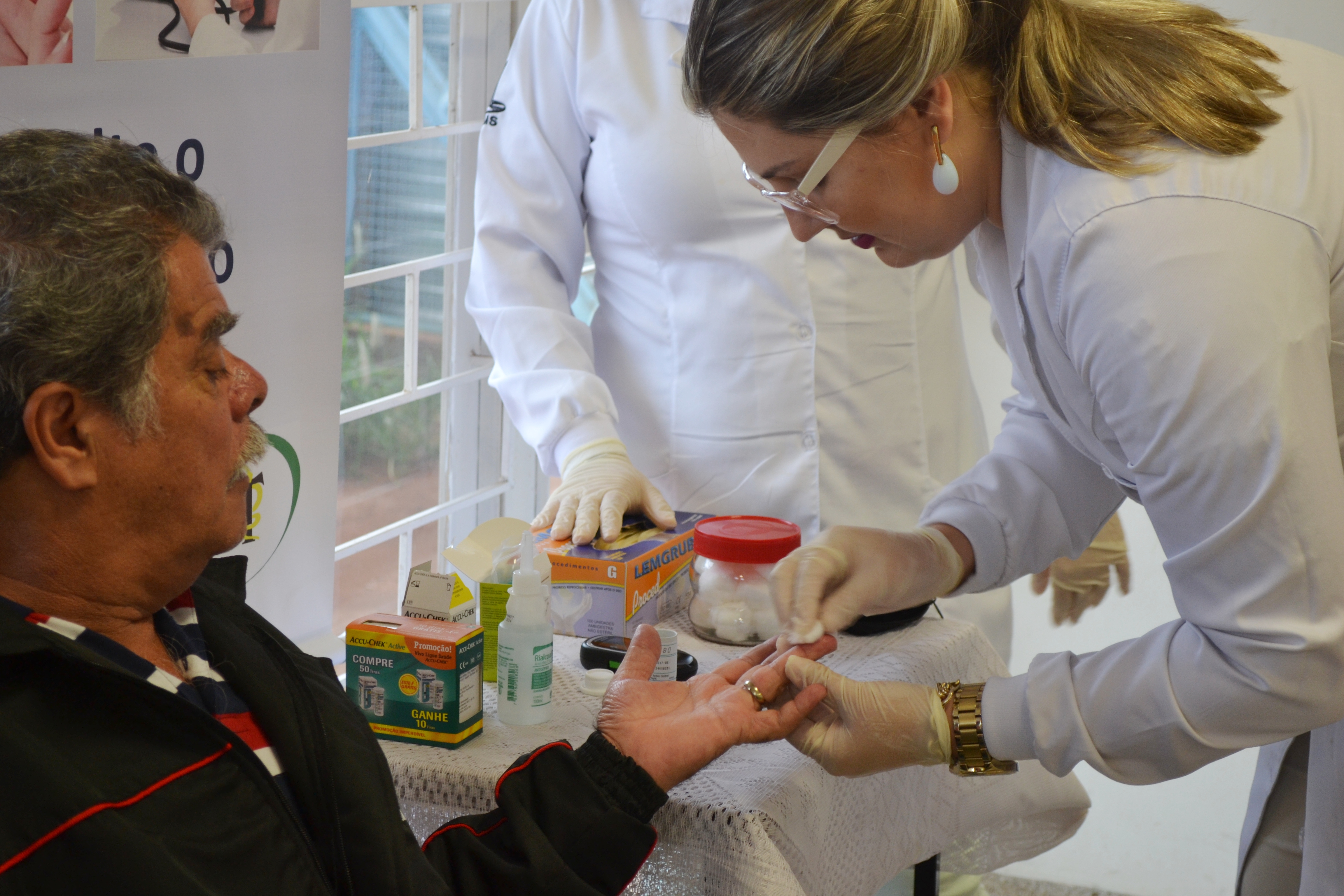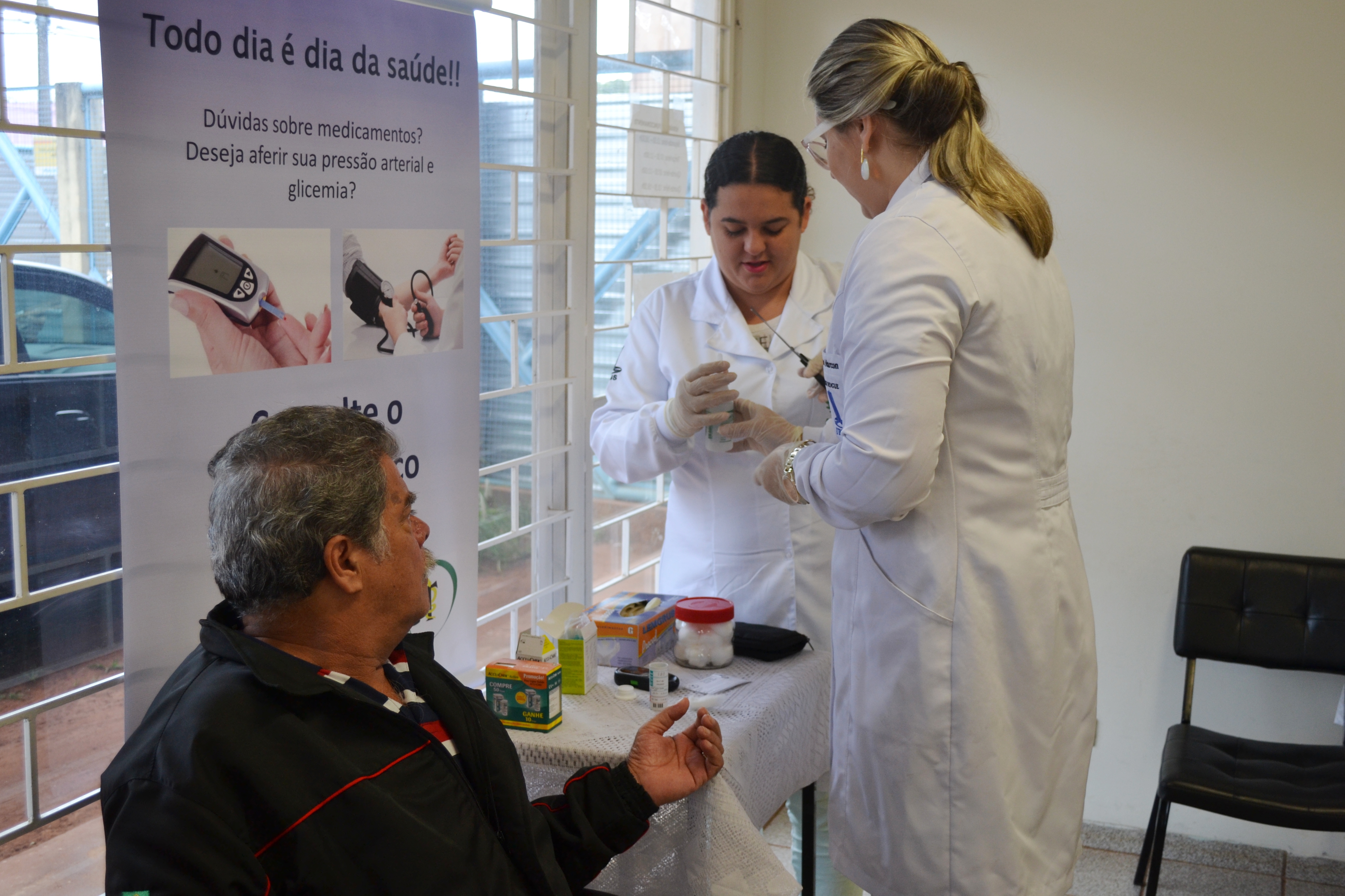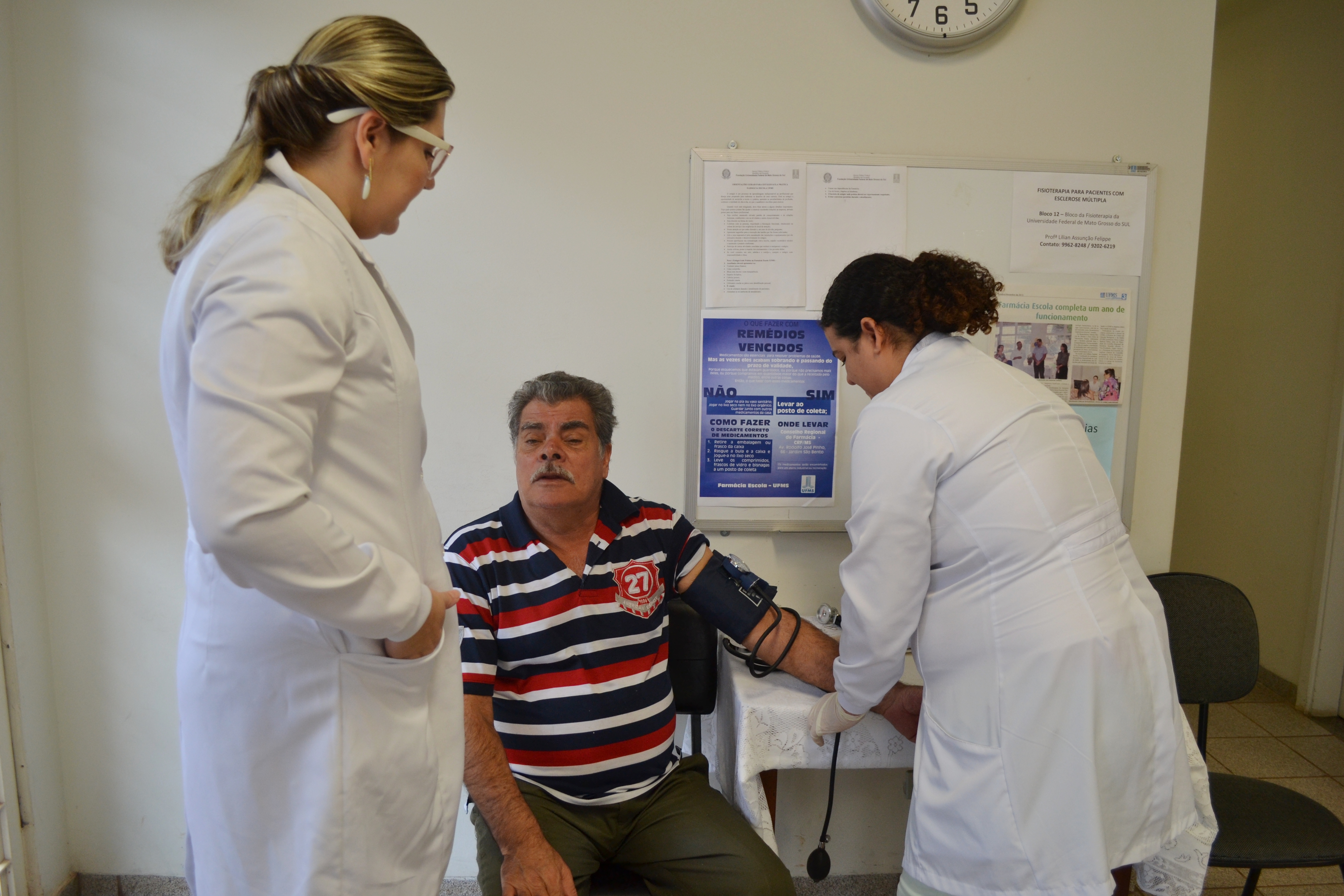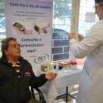 A acadêmica do sexto semestre de Farmácia, Elizabete Chiavelli de Lima, foi quem realizou a aferição de pressão de Moisés, sob a orientação farmacêutica Vanessa Marcon de Oliveira. Esta, por sua vez, aferiu a glicemia do paciente orientando a acadêmica para os próximos atendimentos. Elizabete conta que entrou há dois meses no Programa de Educação Tutorial (PET) e tem se beneficiado dos atendimentos que acompanha. “Tem sido uma experiência muito proveitosa pra minha formação, aqui consigo ver na vivência da farmácia como é o paciente, suas reações, e mais importante, consigo compreender e acompanhar sua individualidade”, afirmou.