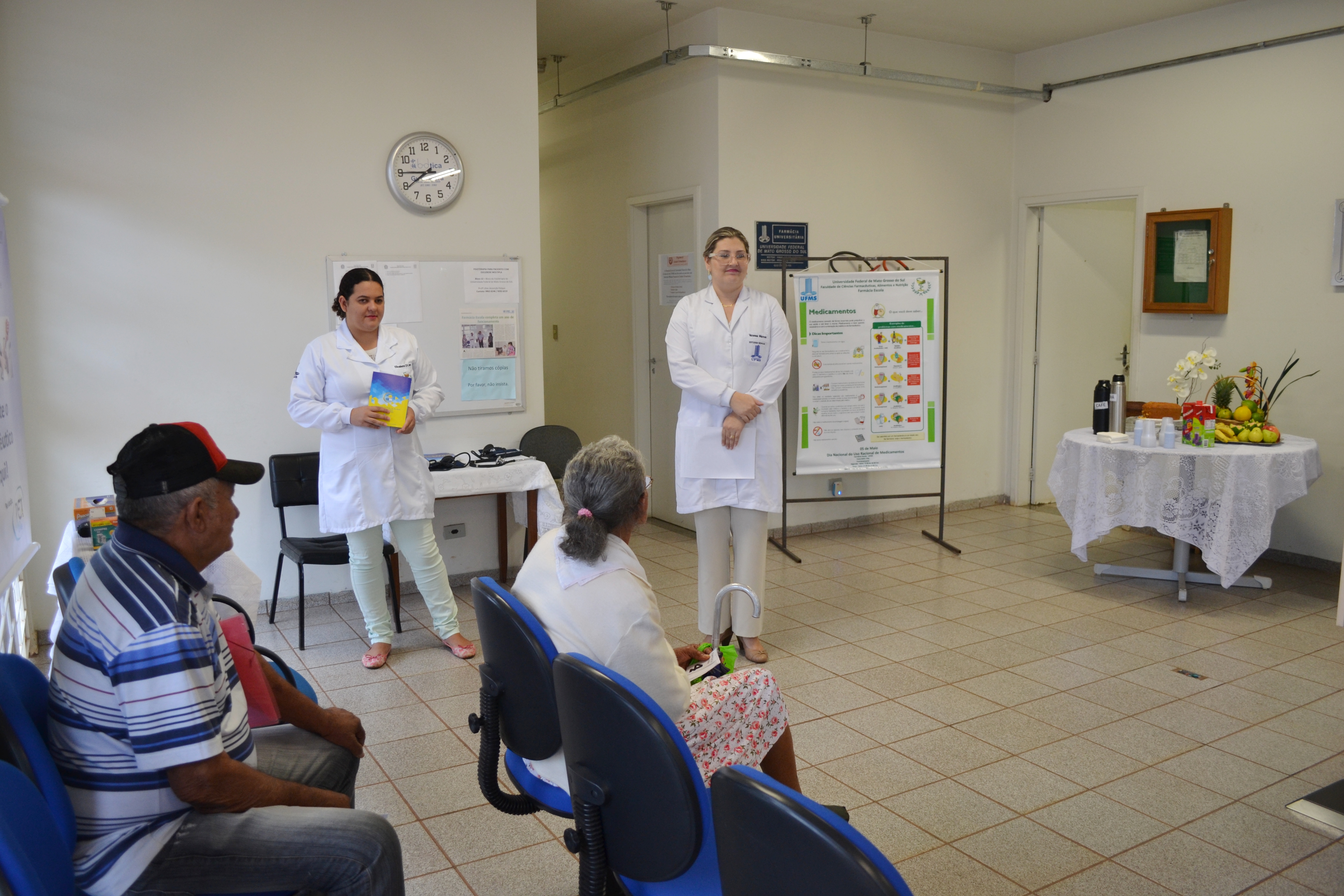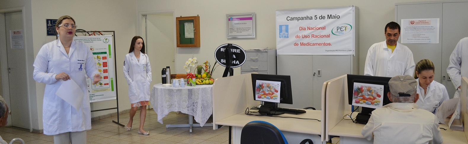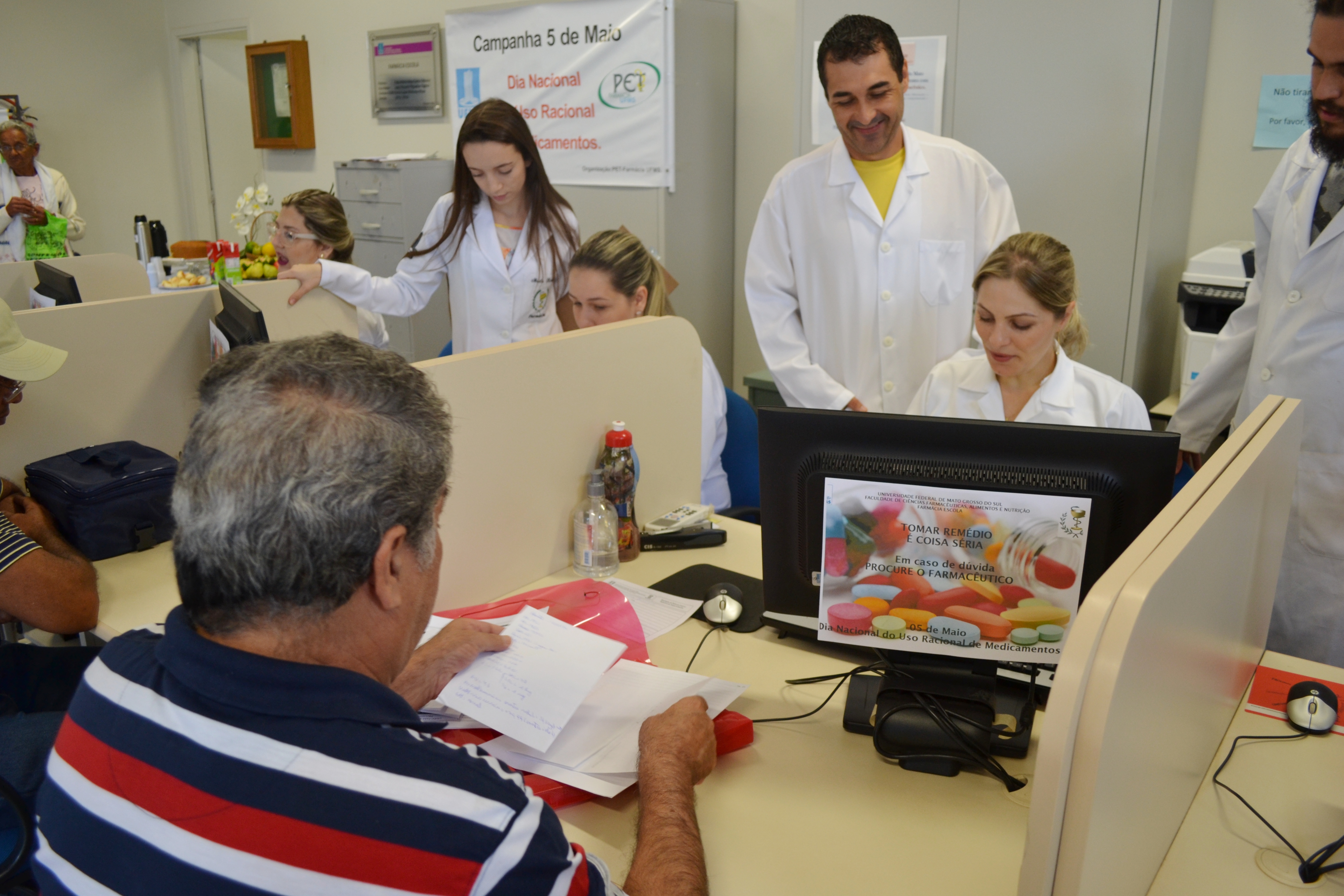 Celebrado no dia 5 de maio, o Dia Nacional do Uso Racional de Medicamentos foi antecipado na Farmácia Escola da UFMS. Hoje (4) os pacientes que foram buscar seus medicamentos foram recebidos com folderes, informações, serviços como aferição de pressão e de glicemia e um café da manhã. A ação foi realizada com a participação dos acadêmicos do PET Farmácia.