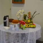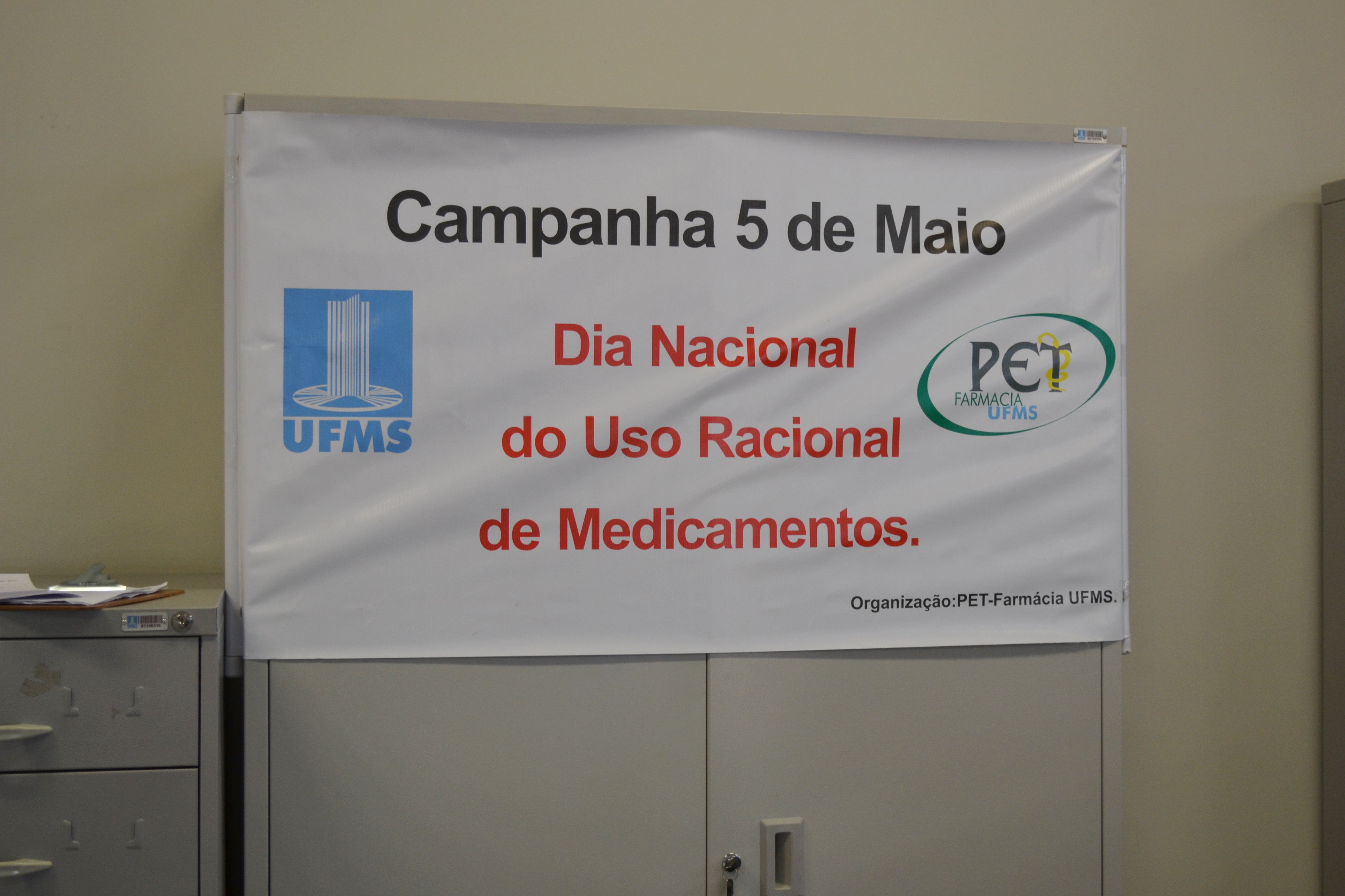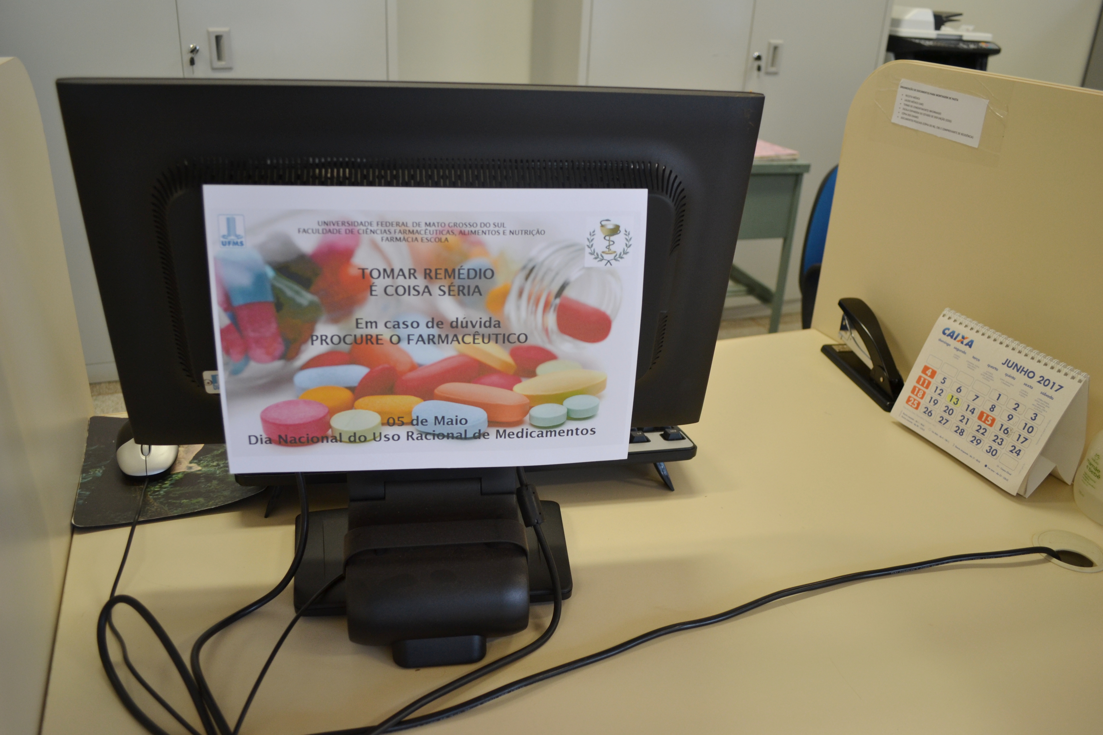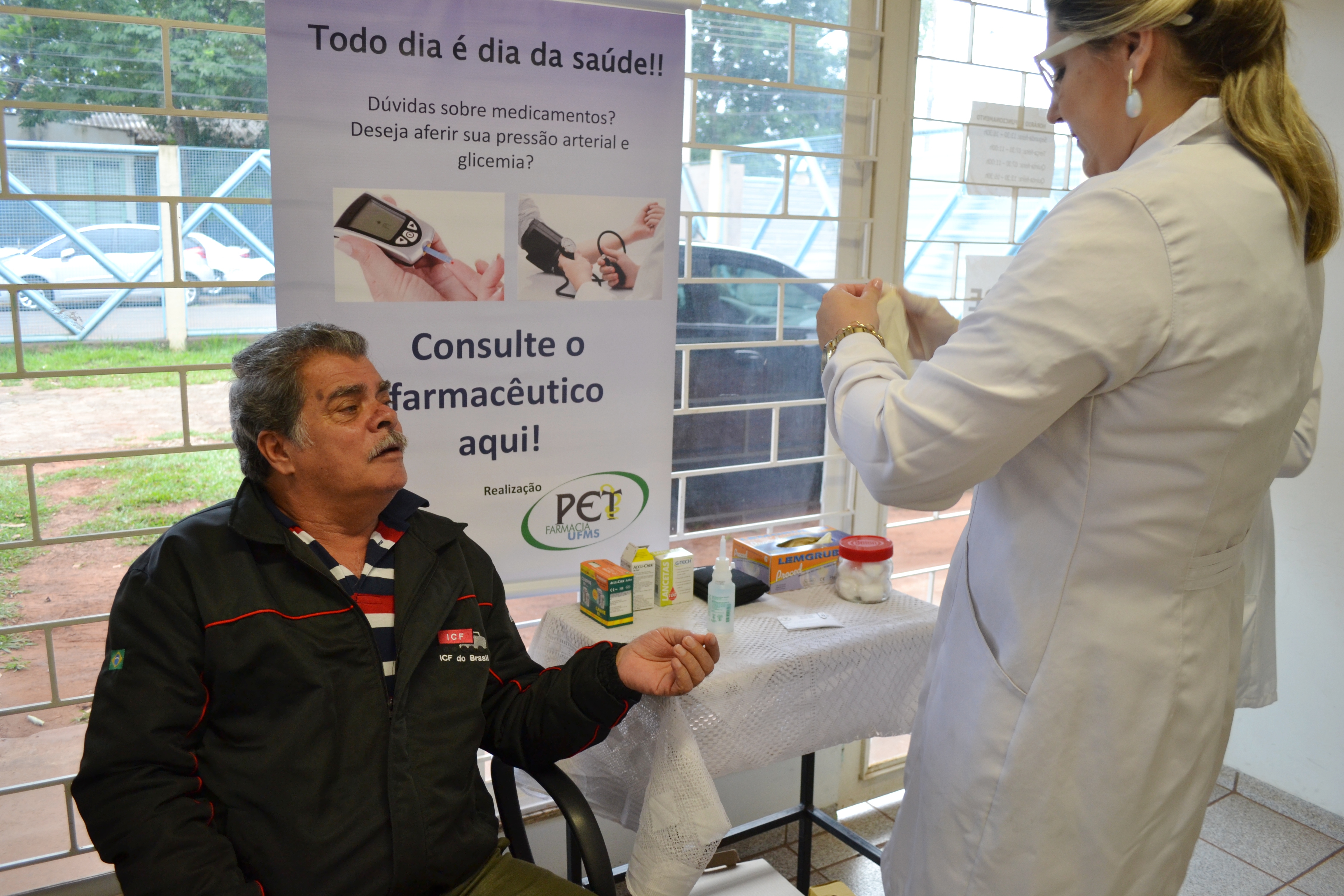 Celebrado no dia 5 de maio, o Dia Nacional do Uso Racional de Medicamentos foi antecipado na Farmácia Escola da UFMS. Hoje (4) os pacientes que foram buscar seus medicamentos foram recebidos com folderes, informações, serviços como aferição de pressão e de glicemia e um café da manhã. A ação foi realizada com a participação dos acadêmicos do PET Farmácia.