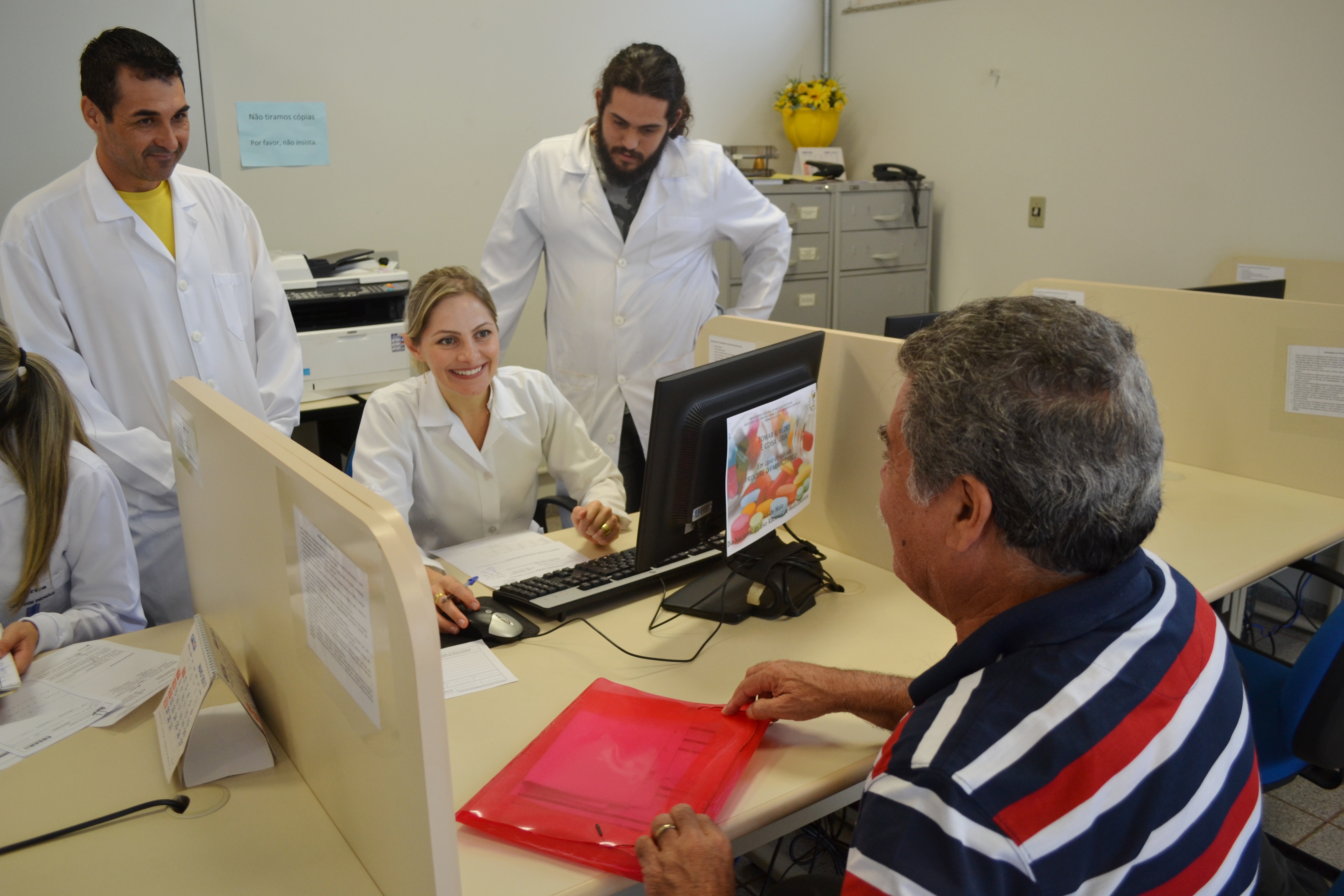 Além de Erika e Vanessa, atendem na Farmácia Escola a farmacêutica Cristiane Munaretto Ferreira e o coordenador do local e tutor do PET, professor Teófilo Mazon Cardoso. Ainda dois alunos de mestrado realizam pesquisas na Farmácia Escola e acadêmicos da graduação realizam atividades práticas.