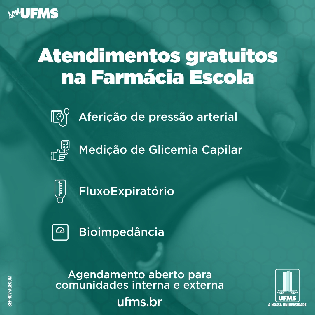 Os atendimentos são feitos por meio do projeto de extensão Cuidado farmacêutico como estratégia de Extensão na Farmácia Escola Profª Ana Maria Cervantes Baraza , com o objetivo de contribuir para a manutenção da saúde e qualidade de vida da comunidade.