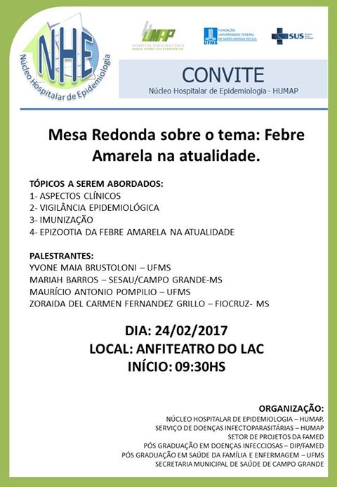 O Núcleo Hospitalar de Epidemiologia do Hospital Universitário Maria Aparecida Pedrossian (HUMAP/UFMS) realiza, no dia 24 de fevereiro, sexta-feira, mesa redonda sobre o tema Febre Amarela na Atualidade. O evento será às 9h30, no anfiteatro do LAC.