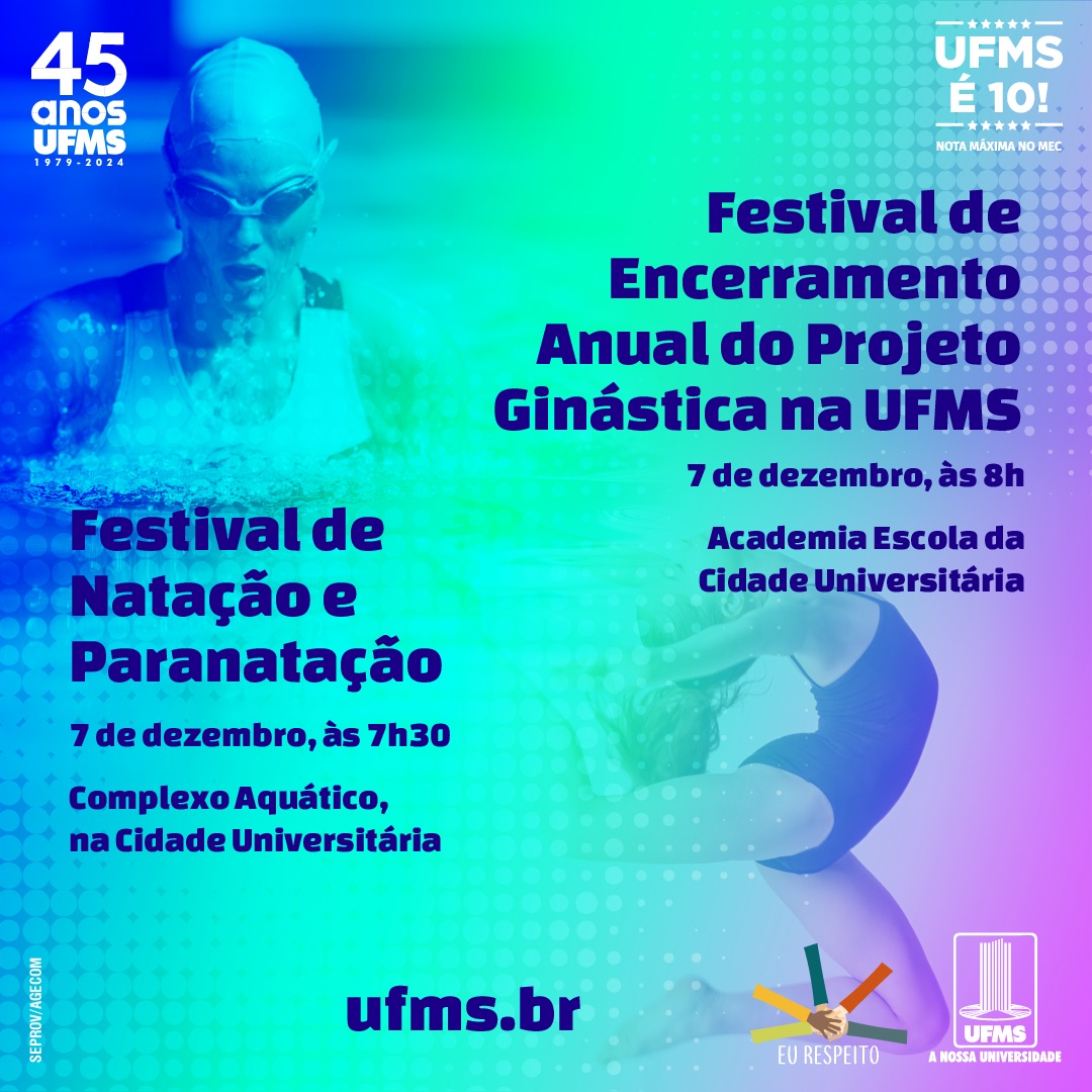 No próximo sábado, 7, serão realizados na Cidade Universitária os festivais de Natação e Paranatação e de Encerramento Anual do Projeto Ginástica na UFMS. As ações são gratuitas e abertas a toda a comunidade.