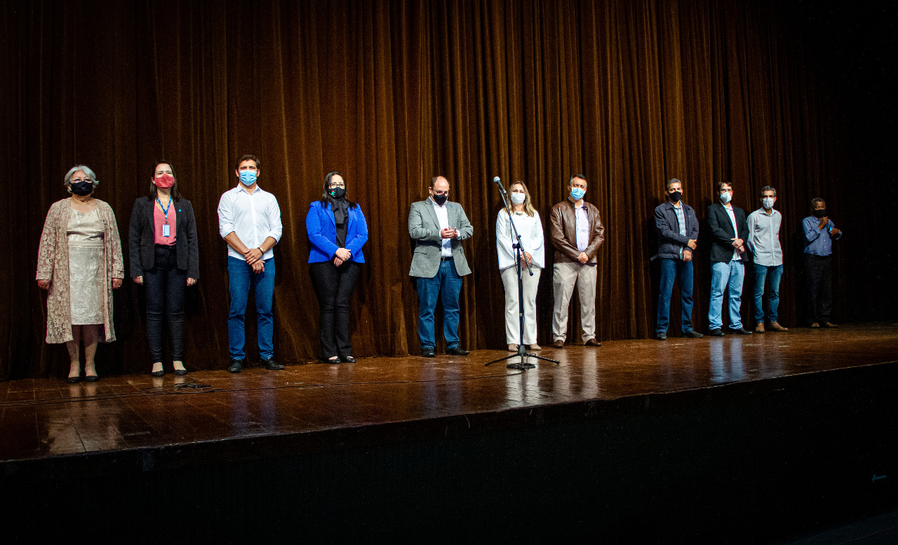 Nesta sexta-feira, 13, foi lançado o Festival Universitário da Canção (FUC) promovido pela Universidade Federal de Mato Grosso do Sul, Governo do Estado de MS e TV Morena. A cerimônia foi realizada no Teatro Glauce Rocha, que completa 50 anos em 2021, e contou com a participação do reitor Marcelo Turine e da vice-reitora Camila ítavo; da reitora do IFMS e futura presidente do Conselho de Reitores das Instituições de Ensino Superior de Mato Grosso do Sul, Elaine Cassiano; do pró-reitor de Extensão, Cultura e Esporte (Proece), Marcelo Fernandes; do secretário adjunto de Cidadania e Cultura e representante do Governo do Estado Eduardo Romero, do gerente de programação da TV Morena Ricardo Neves, do diretor da Faculdade de Artes, Letras e Comunicação (Faalc), Gustavo Penha; da presidente da Academia Feminina de Letras e Artes (AFLA) de MS, Delasnieve Daspet; do chefe da Secretaria de Cultura e Esporte da Proece, Eduardo Escrivano; do diretor de Cultura e Esporte da Proece, João Santana; da servidora aposentada Marineide Servigne que foi responsável pelo Teatro Glauce Rocha e coordenou várias edições do FUC, além de servidores, pró-reitores e diretores das agências.