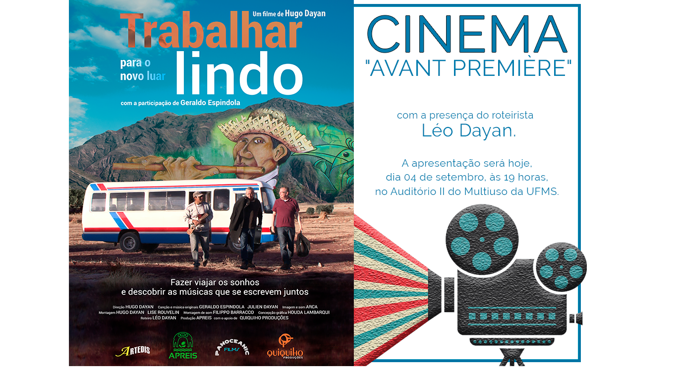 Dirigido por Hugo Dayan, o filme “Trabalhar Lindo para o Novo Luar” será exibido gratuitamente hoje, dia 4/9, às 19 horas, no Auditório 2 do Multiuso da UFMS. O longa é uma produção brasileira que conta com a participação do cantor sul-mato-grossense Geraldo Espíndola e outros vários artistas locais.
