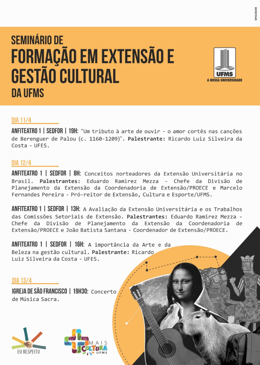 Na programação do seminário estão quatro palestras e para cada uma delas será emitido certificado de participação para os inscritos. O professor Ricardo Luiz Silveira da Costa, da Universidade Federal do Espírito Santo (UFES), foi convidado para ministrar duas: “Um tributo à arte de ouvir – o amor cortês nas canções de Berenguer de Palou” e “A importância da Arte e da Beleza na gestão cultural”.