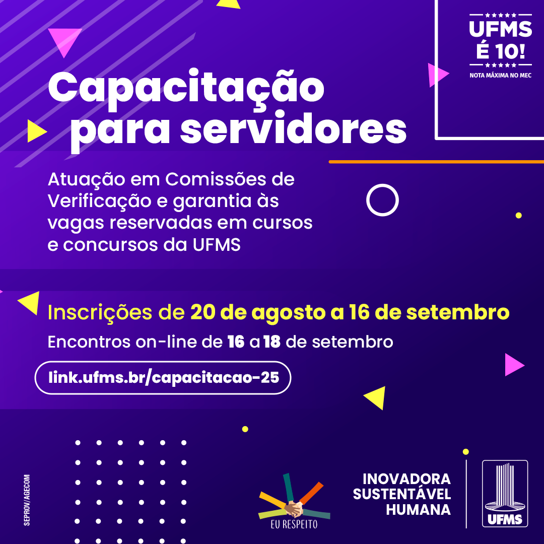 Estão abertas as inscrições para a Formação integrada para a atuação em comissões de verificação e garantia dos direitos às vagas reservadas em cursos e concursos da UFMS. A ação é voltada a professores e técnicos-administrativos efetivos da Universidade. Os servidores interessados devem se inscrever até 16 de setembro nesta página, com acesso pelo Passaporte UFMS.