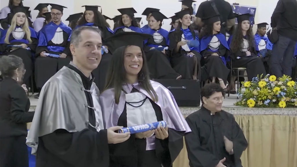 A licenciada em Ciências Sociais, Marina Faria dos Santos discursou em nome de todos concluintes da noite. “Nós podemos mudar, nos tornar alguém novo, experimentar coisas diferentes. Nada é definitivo, e nós temos o poder de decidir e construir uma vida que cada uma ama. Podemos ir da escuridão ao paraíso em um curto espaço de tempo. E, quando não soubermos para onde ir, vamos olhar para trás e lembrar, pelo menos, de onde viemos. Meus parabéns, formandos de 2025. O futuro começa agora”, pontuou.