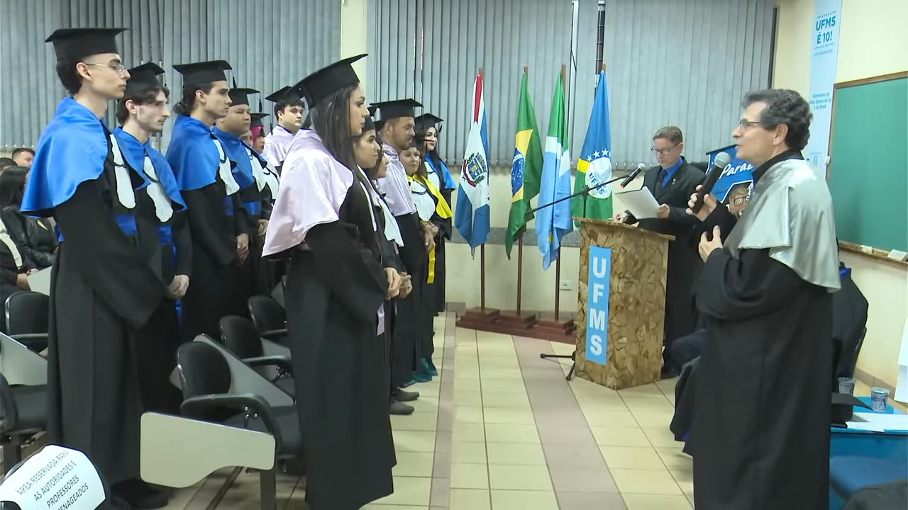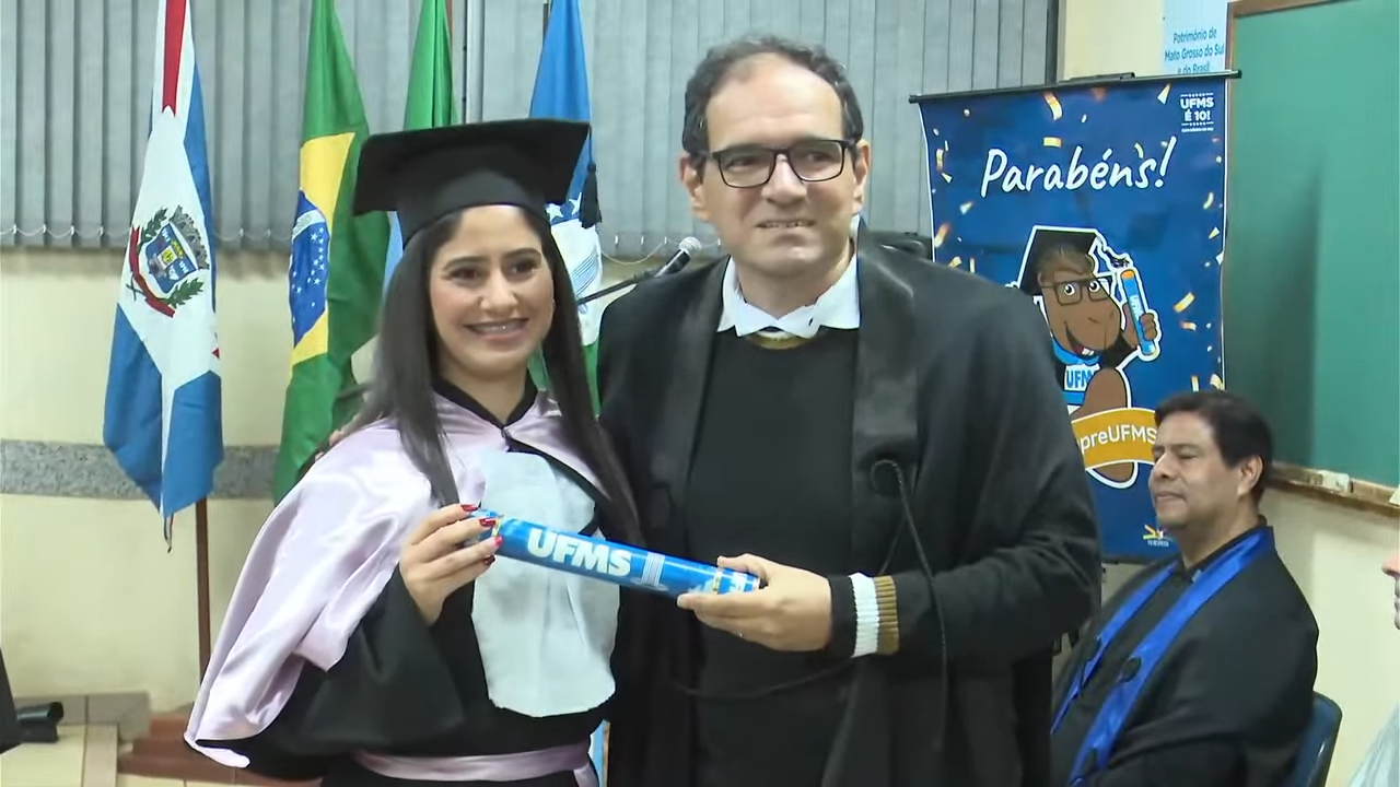 Presidindo a cerimônia, o vice-reitor Albert Schiaveto reconheceu o valor da educação, da coletividade e do compromisso da Universidade com a transformação social. “Agradeço a todos os pais por estarem aqui presentes, por participarem dessa trajetória e, acima de tudo, por confiarem em nós. O sucesso de vocês, formandos, é também o nosso sucesso. Este é um momento muito importante, repleto de significado”, discursou. “O talento pode nos levar longe, mas é o caráter que nos mantém lá. E caráter não tem preço. Sejam profissionais íntegros e comprometidos com as transformações que a nossa sociedade precisa. Parabéns, profissionais! E lembrem-se: queremos que vocês voltem sempre para a nossa Universidade. As portas da UFMS estarão sempre abertas para vocês”, complementou.