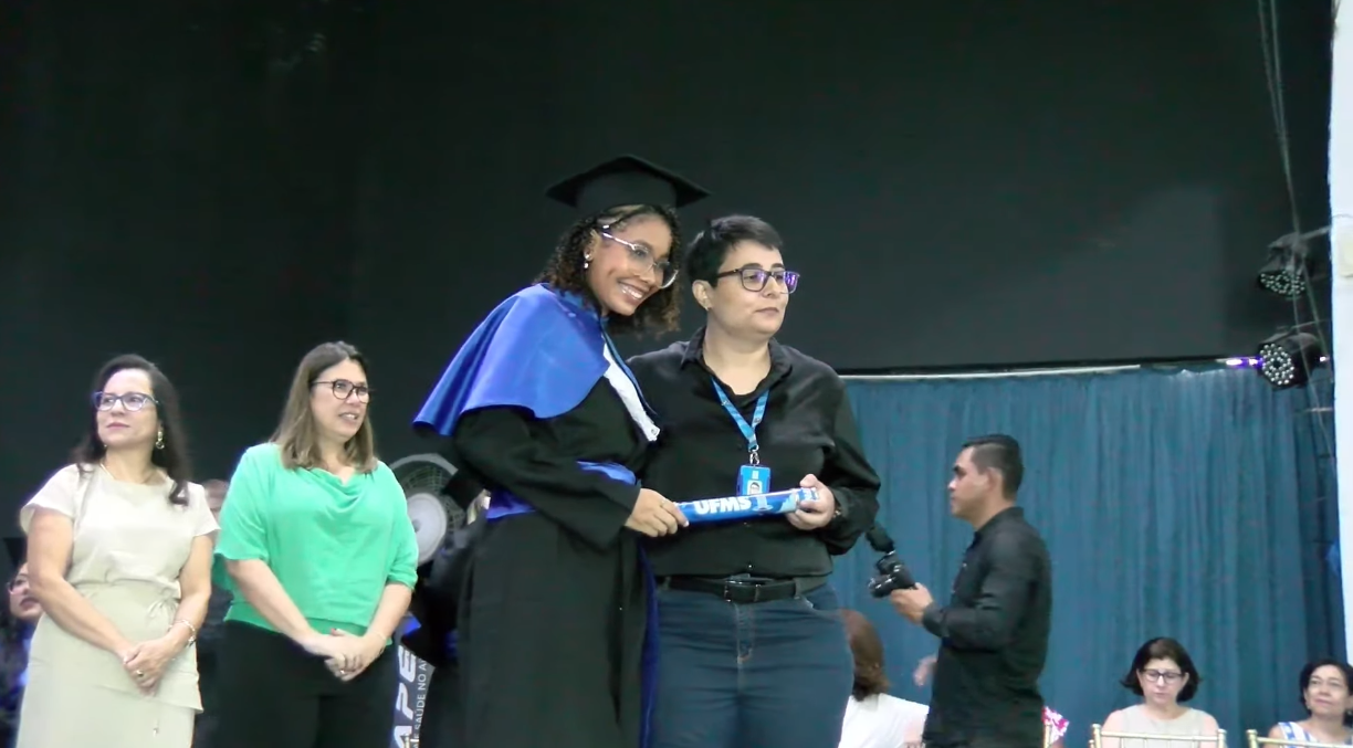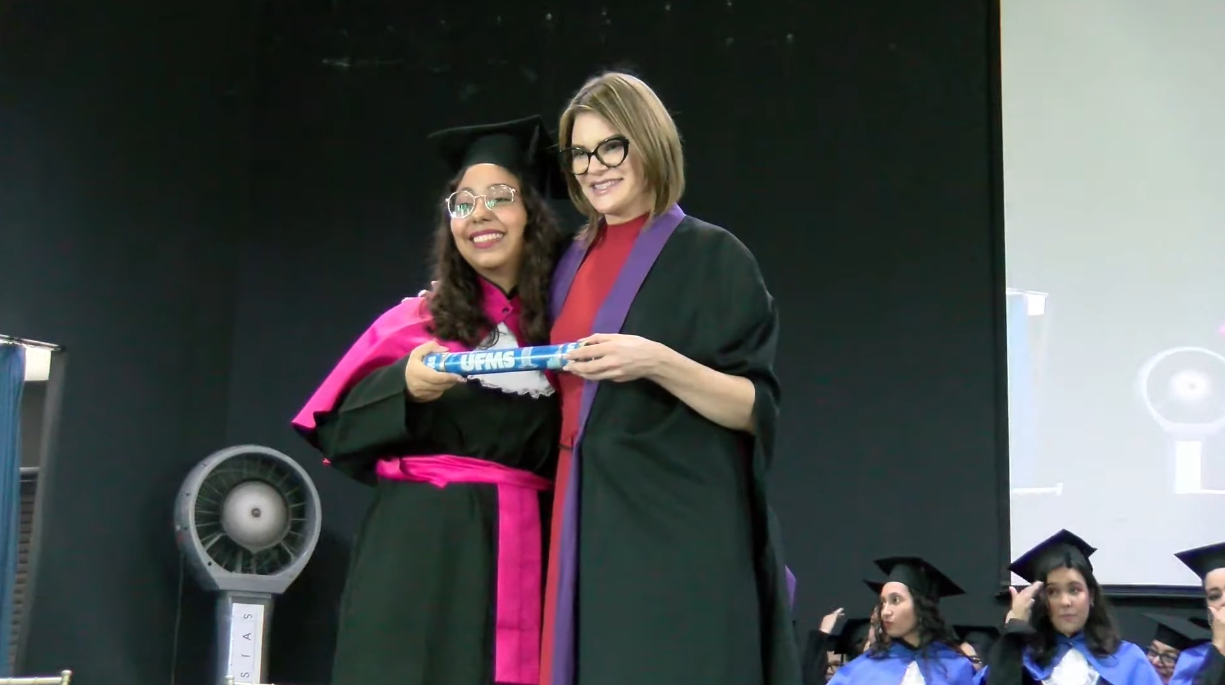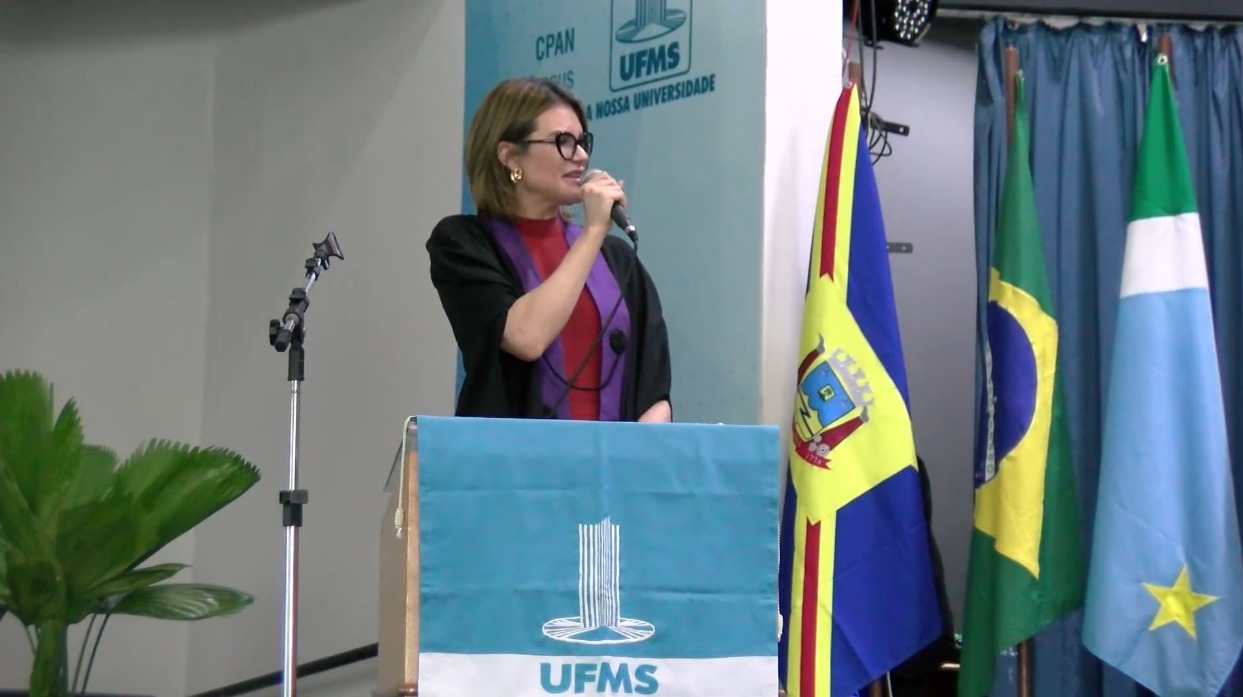A diretora do CPan, Andreliza de Souza, agradeceu aos familiares e amigos pelo suporte aos estudantes ao longo dos anos de graduação. “Estamos aqui pela vitória de todos que estão neste palco. São dois momentos muito alegres para nós: a semana de acolhimento dos calouros e a colação de grau. Momentos corridos e cansativos, mas que dão significado a nossa ação. […] O que eu tenho a desejar a vocês: sejam cada vez maiores e cresçam! Vocês vão levar o nome da UFMS para sempre no currículo de vocês. Mas que vocês possam ter dentro de vocês a centelha do conhecimento. Que vocês possam levar esse desejo do aprender, do acrescer e de serem cada vez maiores. E que vocês possam também voltar para a UFMS, que esse conhecimento que vocês construíram e que vocês já possuem possam ser ampliadas”.