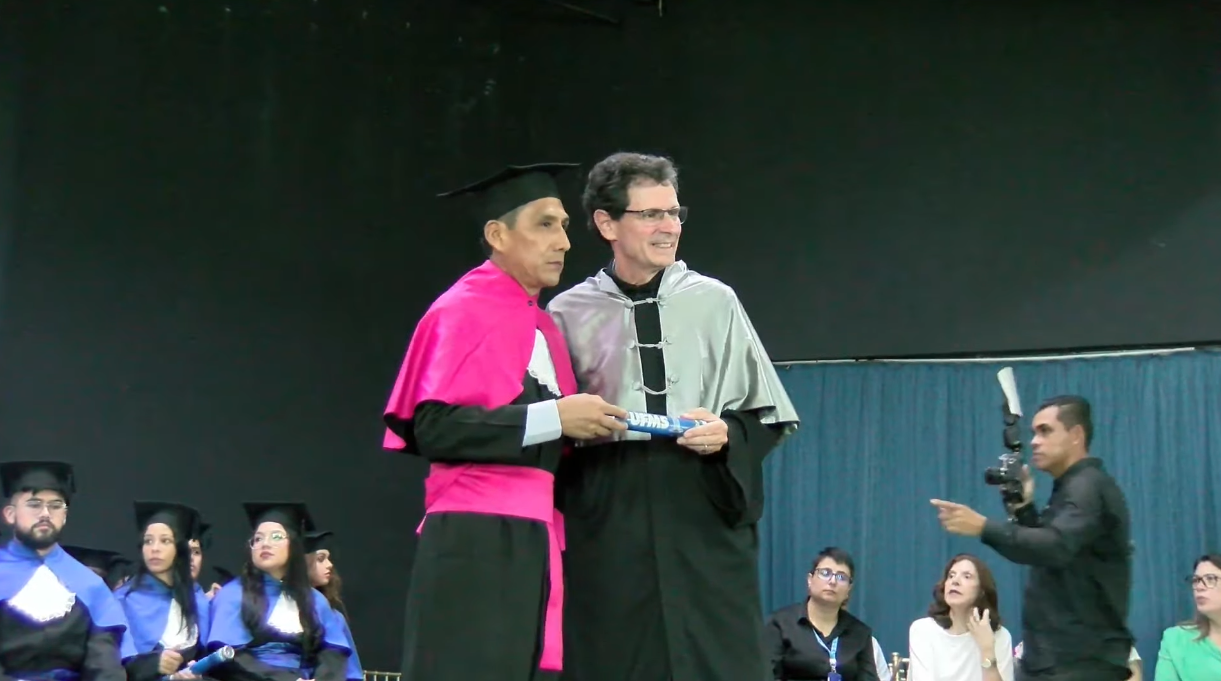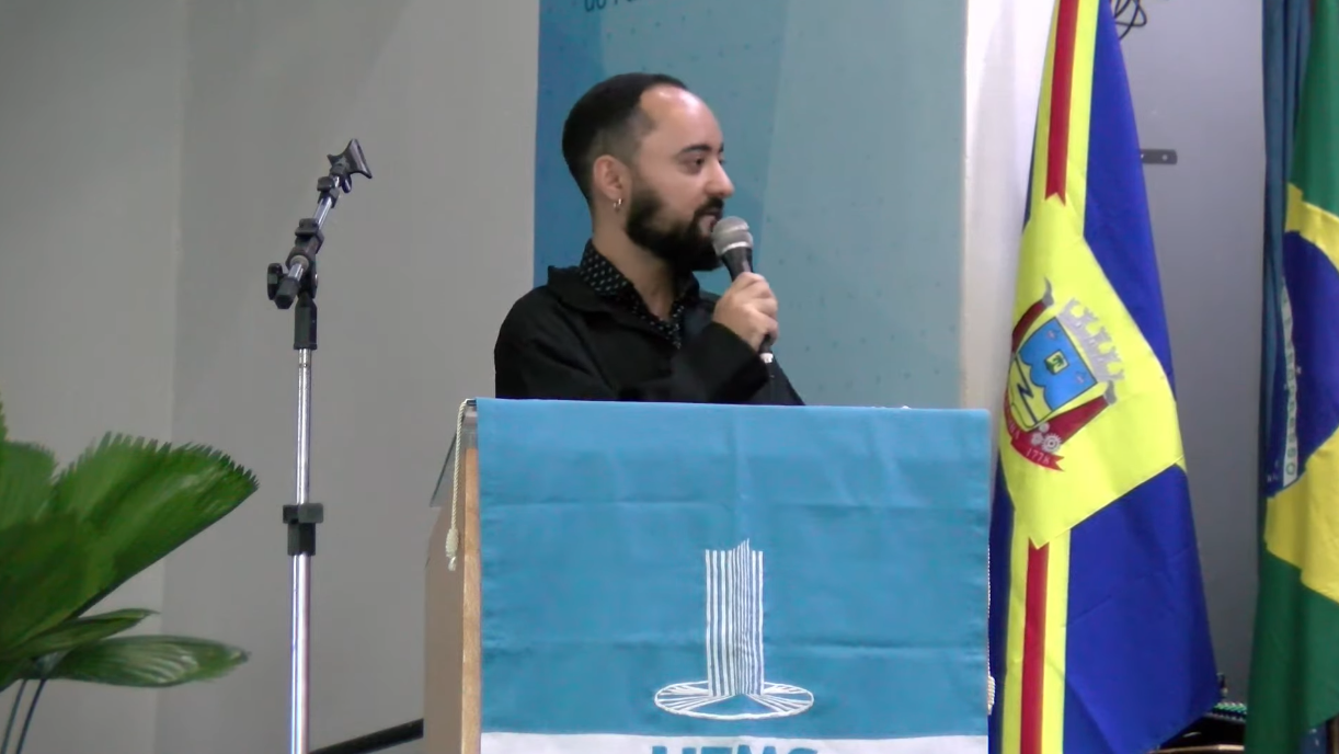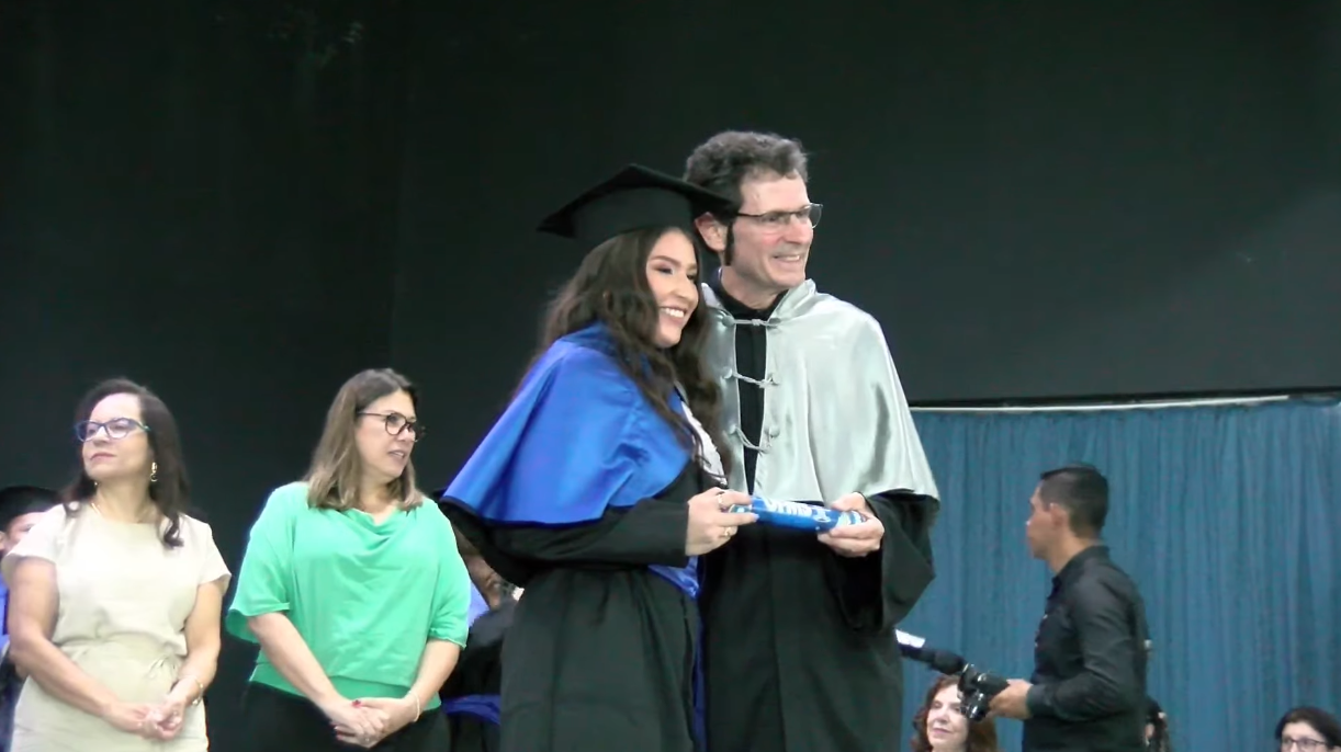 O paraninfo da turma de Ciências Biológicas, professor Fabiano Pinto de Abreu, falou sobre o futuro de cada formando. “Hoje o que celebramos não cabe apenas em um diploma, cabe no cansaço acumulado, nas perguntas que ficaram sem resposta, nos caminhos refeitos, nas escolhas silenciosas que ninguém viu, cabe dizer que também é um dos sonhos que se tornam realidade, dentre vários sonhos que nós temos. Cada um de vocês chegou até aqui de um jeito único, carregando dúvidas, medos, convicções provisórias e uma vontade persistente de continuar. A Universidade não os entregou verdades prontas e absolutas, entregou ferramentas. […] Daqui pra frente o mundo não pedirá apenas competência, pedirá sensibilidade, pedirá responsabilidade sobre o que se faz, sobre o que se cale e sobre o que se escolhe defender. O conhecimento que vocês carregam tem peso e direção, que ele nunca seja usado para diminuir, excluir ou silenciar, mas para ampliar possibilidades”, disse.