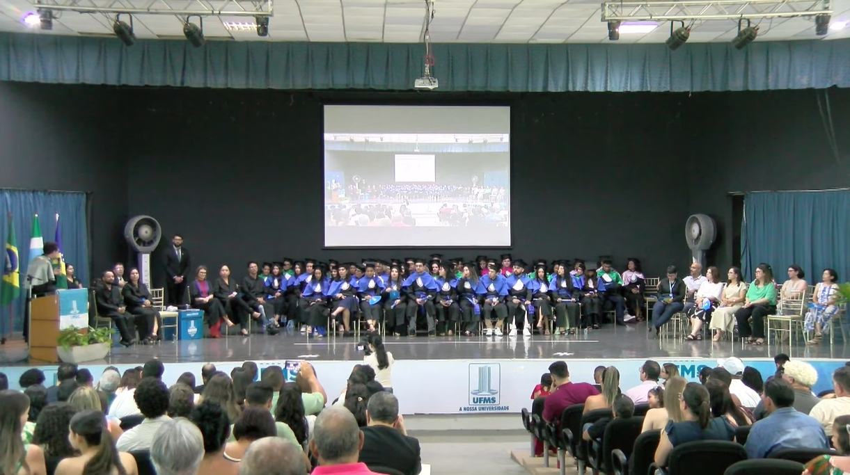 Na tarde desta segunda-feira, 15, 59 formandos da UFMS do Pantanal (CPan) participaram de cerimônia de colação de grau dos cursos de Administração, Ciências Biológicas, Ciências Contábeis e Letras – Português e Espanhol, junto a familiares, amigos, professores e técnicos-administrativos. A solenidade foi realizada no auditório Salomão Baruki, com transmissão ao vivo no canal da TV UFMS.