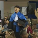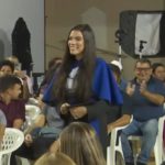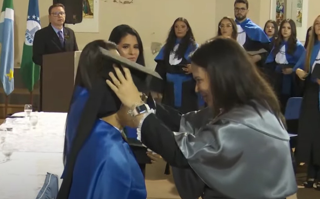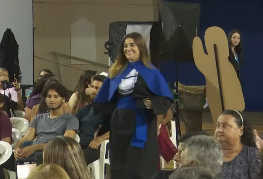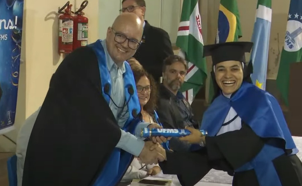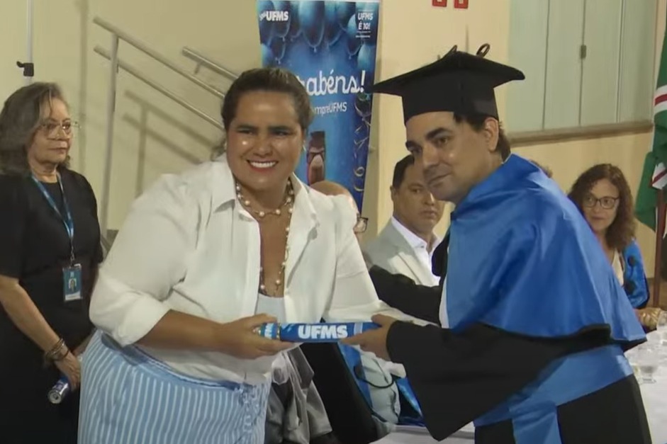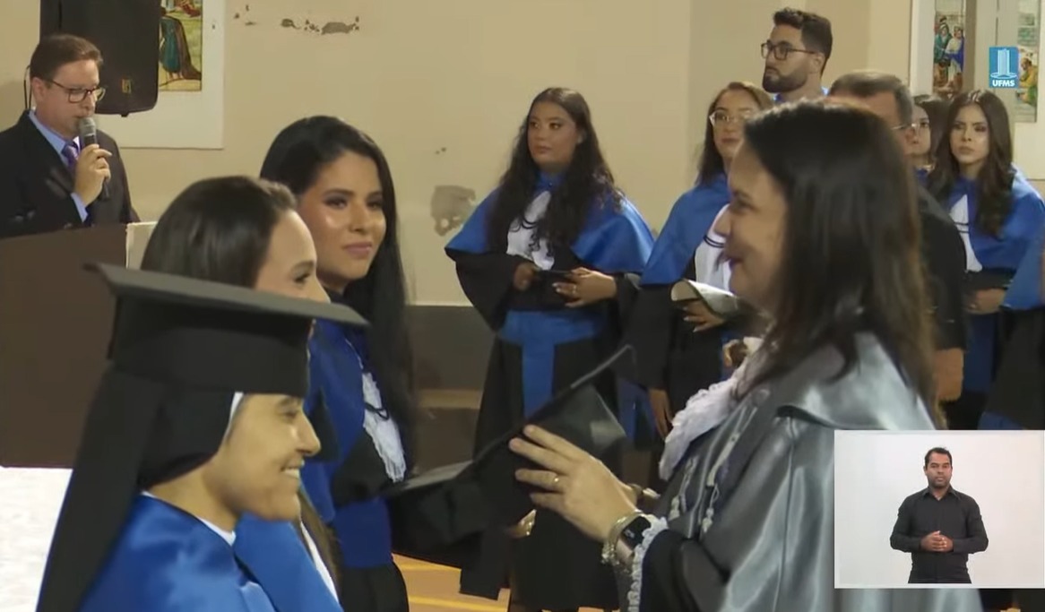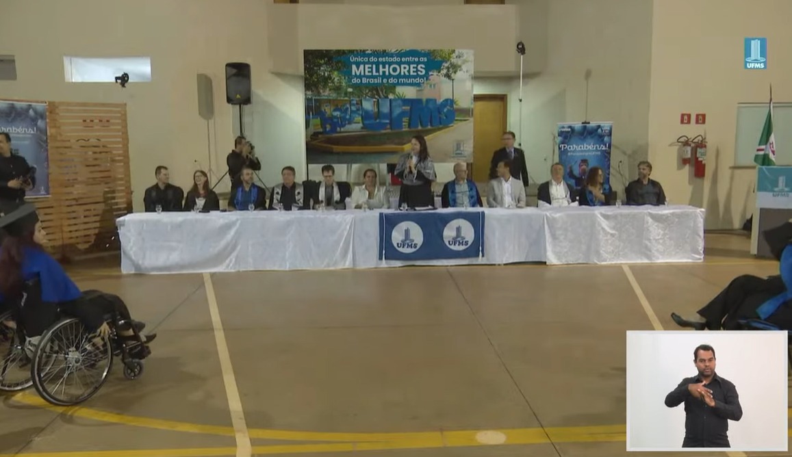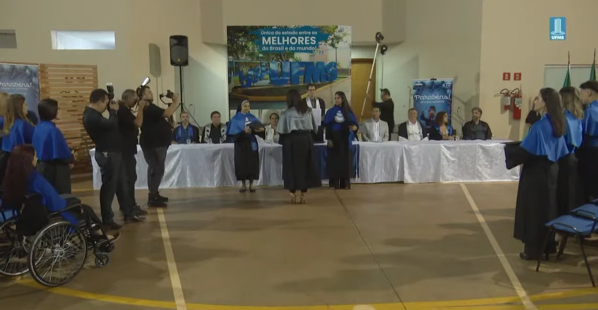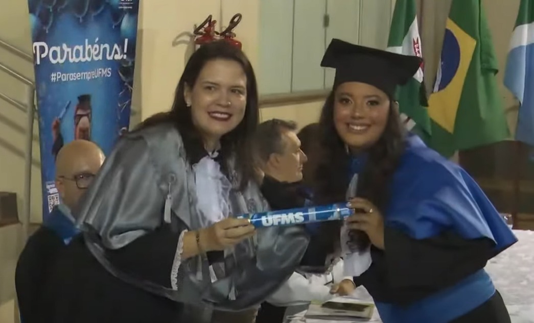 A vice-reitora Camila Ítavo expressou sua felicidade em participar da solenidade. “Hoje somos testemunhas de um momento muito importante na vida de cada um de vocês. Peço, encarecidamente, que percebam, todos aqui, falo em especial para nossas formandas e formandos, que a sessão solene de Colação de Grau é uma cerimônia repleta de símbolos e tradições. Então que vocês lembrem-se, como foi chegar até aqui? Quem muda uma história, quem transforma uma instituição, são as pessoas. Celebrar, agradecer, iluminar o caminho para nós mesmos e permitir que outros também brilhem. Honrem a jornada que cada um de vocês trouxe consigo, com certeza vocês se lembrarão de todos os desafios. Se dessem a palavra a todos aqui, todos teriam histórias de superação para compartilhar. Que vocês sempre sejam promotores do bem, da paz, do diálogo e do respeito entre os povos, as nações e uns aos outros. Que brilhem intensamente, iluminem e criem espaço para seus colegas de curso e campos de estágio. Assim, poderemos formar essa grande rede que é a família UFMS”, disse.