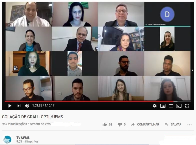Em uma sessão solene virtual, 34 formandos do câmpus de Três Lagoas colaram grau na noite desta quinta-feira, 20. Os recém-graduados concluíram os cursos de Administração, Ciências Contábeis, Engenharia de Produção, História, Letras, Matemática e Sistemas de Informação. A transmissão foi feita neste link, pelo canal da TVU UFMS, para que familiares e amigos acompanhassem o evento.