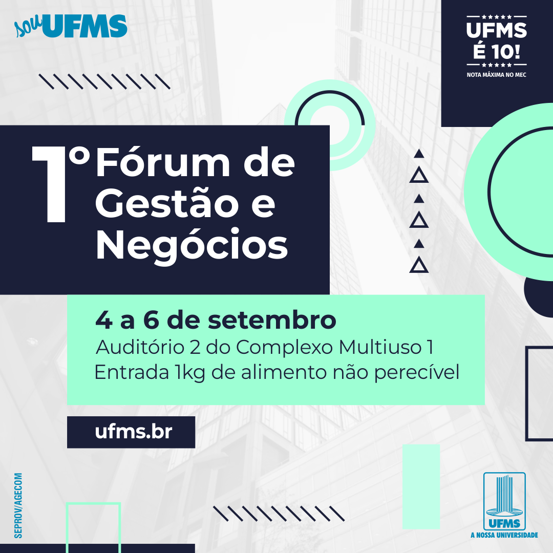 Entre os dias 4 e 6 de setembro será o 1º Fórum de Gestão e Negócios, na Cidade Universitária, com o tema Desafios Globais Contemporâneos. O evento é aberto para as comunidades interna e externa. As inscrições são gratuitas mediante entrega de 1kg de alimento não perecível.