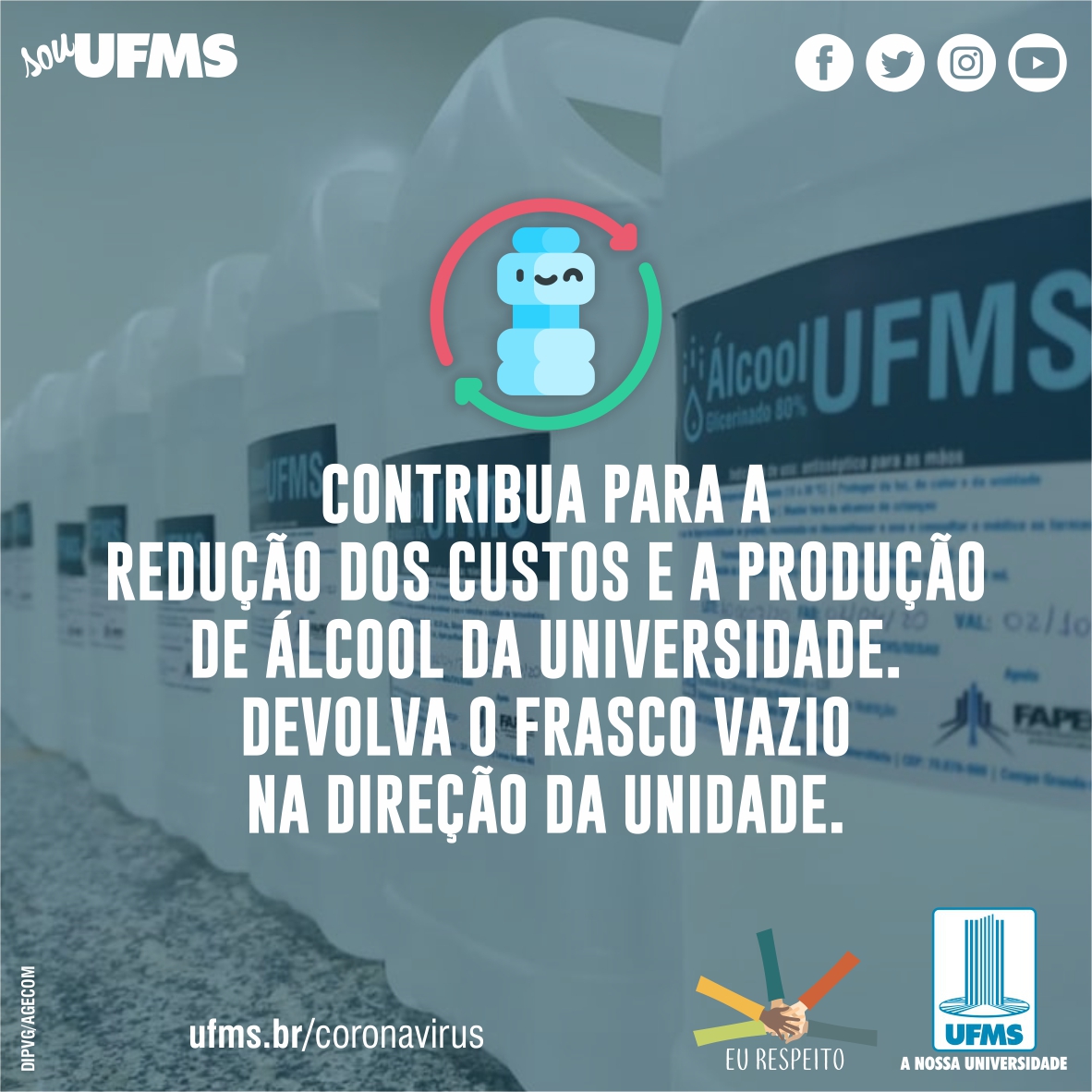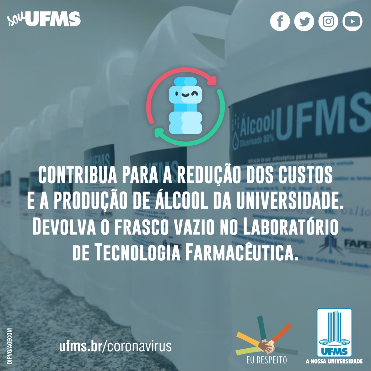 A equipe da Universidade segue produzindo o álcool e agora recebe os frascos vazios para reutilização. De acordo com a professora Nájla Kassab que atua no LTF, podem ser devolvidos os frascos de cinco litros que foram entregues pela UFMS. “Isso porque as normas de fabricação permitem que apenas estes sejam reabastecidos. Mas outras empresas, instituições e pessoas da comunidade que tenham interesse, podem fazer doações de frascos novos de qualquer volume”, disse.