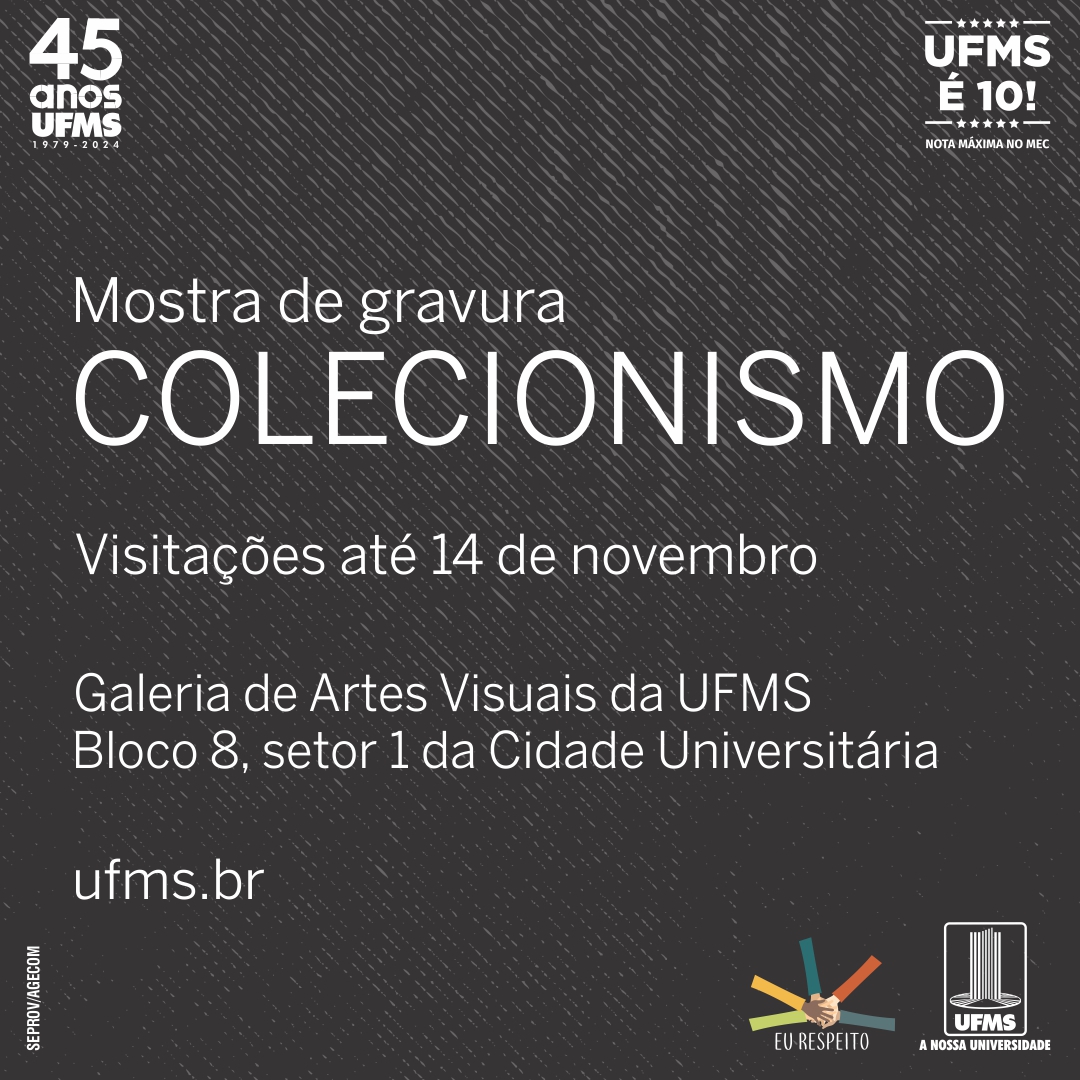 Está em exposição até 14 de novembro a mostra de gravura intitulada Colecionismo, na Galeria de Artes Visuais da UFMS, localizada no piso térreo do Bloco 8, no setor 2 da Cidade Universitária. A exposição apresenta o trabalho de artistas já consolidados no campo da gravura, incluindo nomes renomados na arte brasileira, como Fayga Ostrower, Aldemir Martins, Marcelo Grassmann e J. Borges, entre outros artistas.