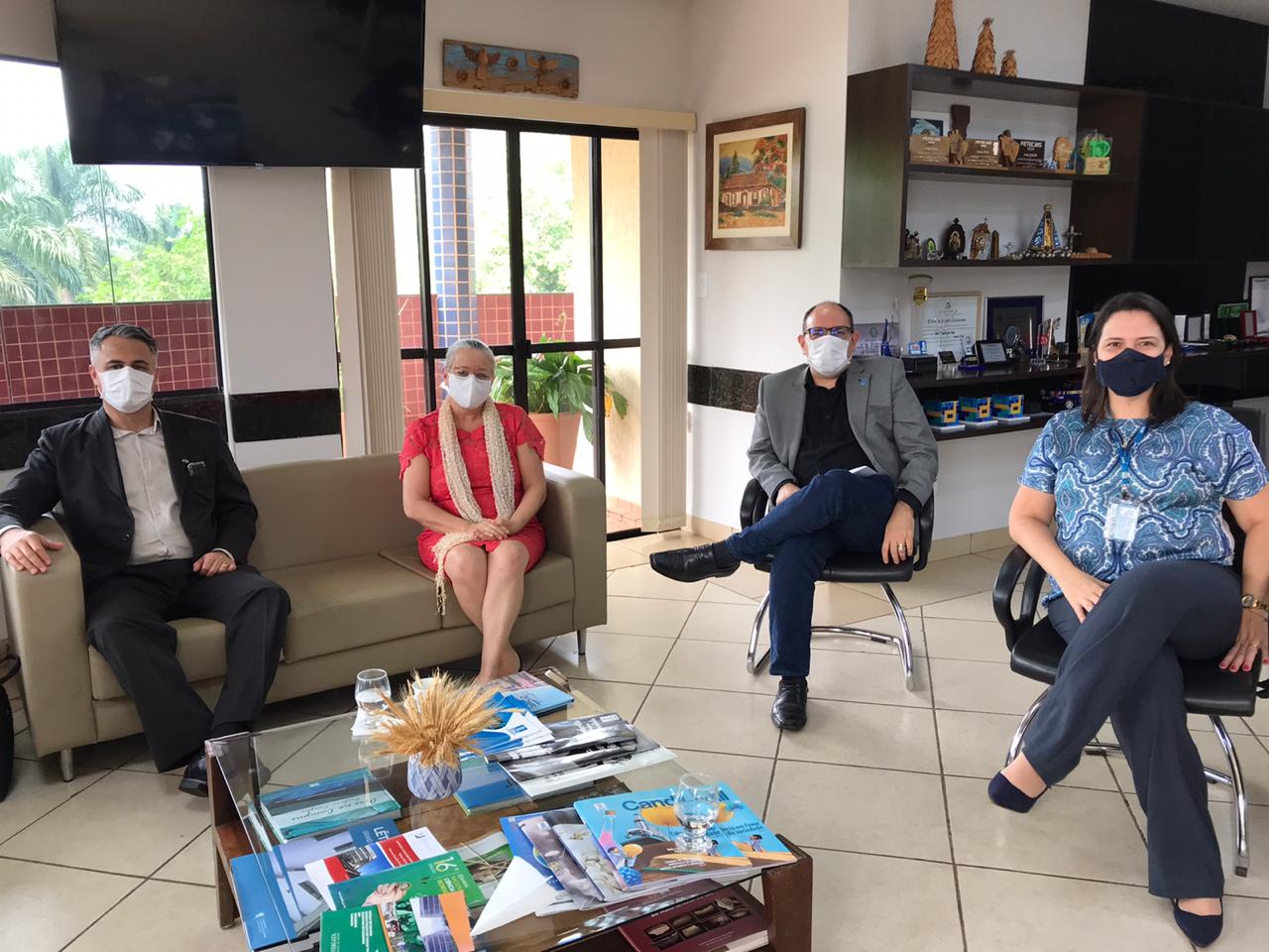 Nesta quinta-feira, 17, o reitor Marcelo Turine e a vice-reitora Camila Ítavo receberam a reitora da Universidade Federal da Grande Dourados Mirlene Damázio e o vice-reitor Luciano Oliveira Geisenhoff. Eles vieram convidar os gestores da UFMS para a inauguração virtual de obras, realizada em 30 de setembro. Na ocasião, discutiram temas ligados ao ensino superior e à pesquisa em Mato Grosso do Sul, bem como o papel das instituições no desenvolvimento de ações para auxiliar no combate da Covid-19.