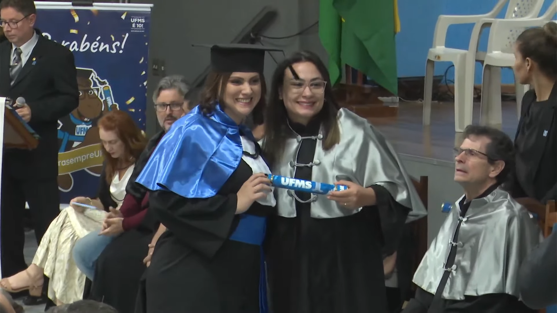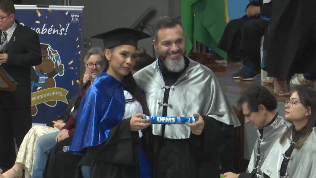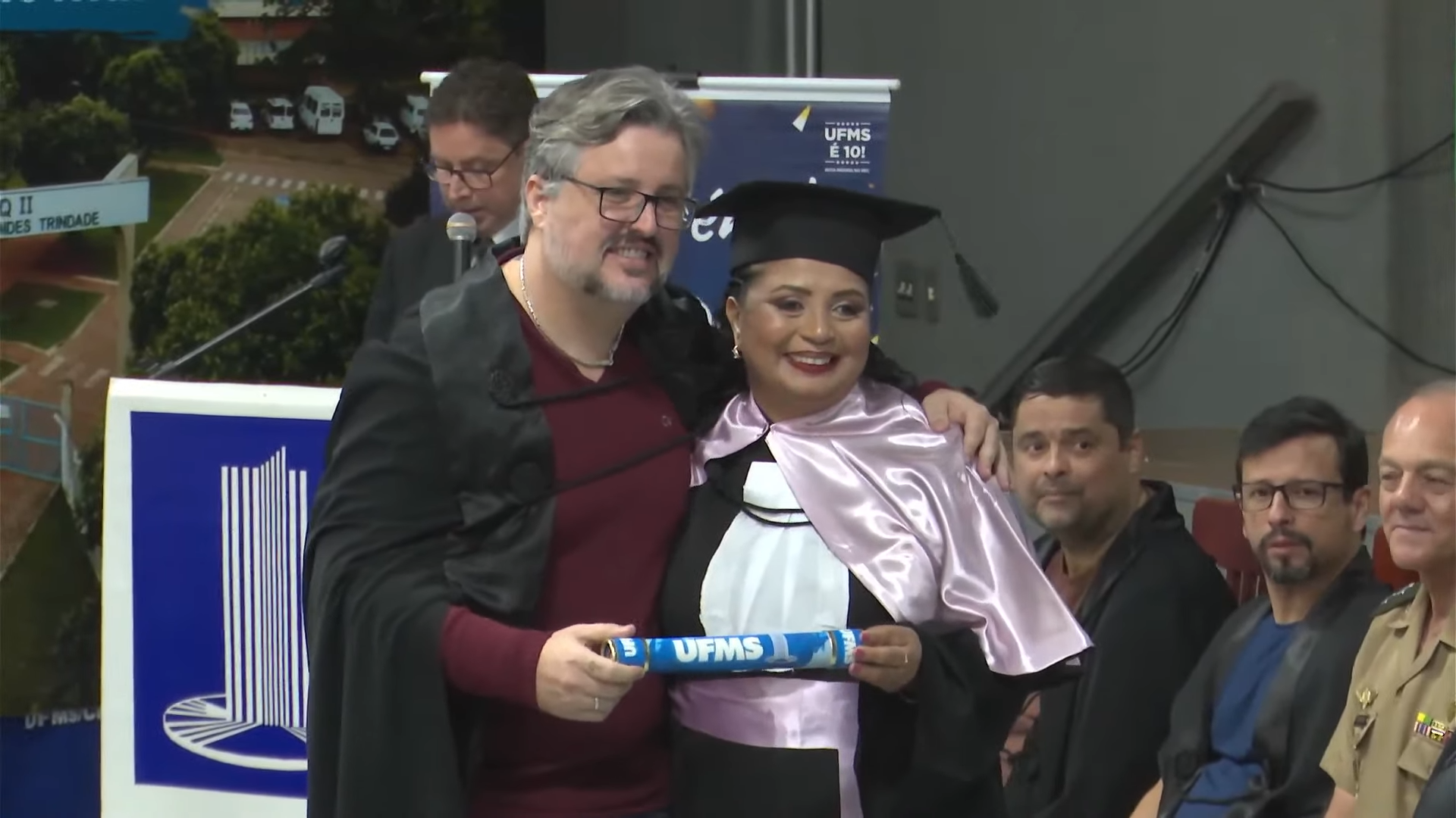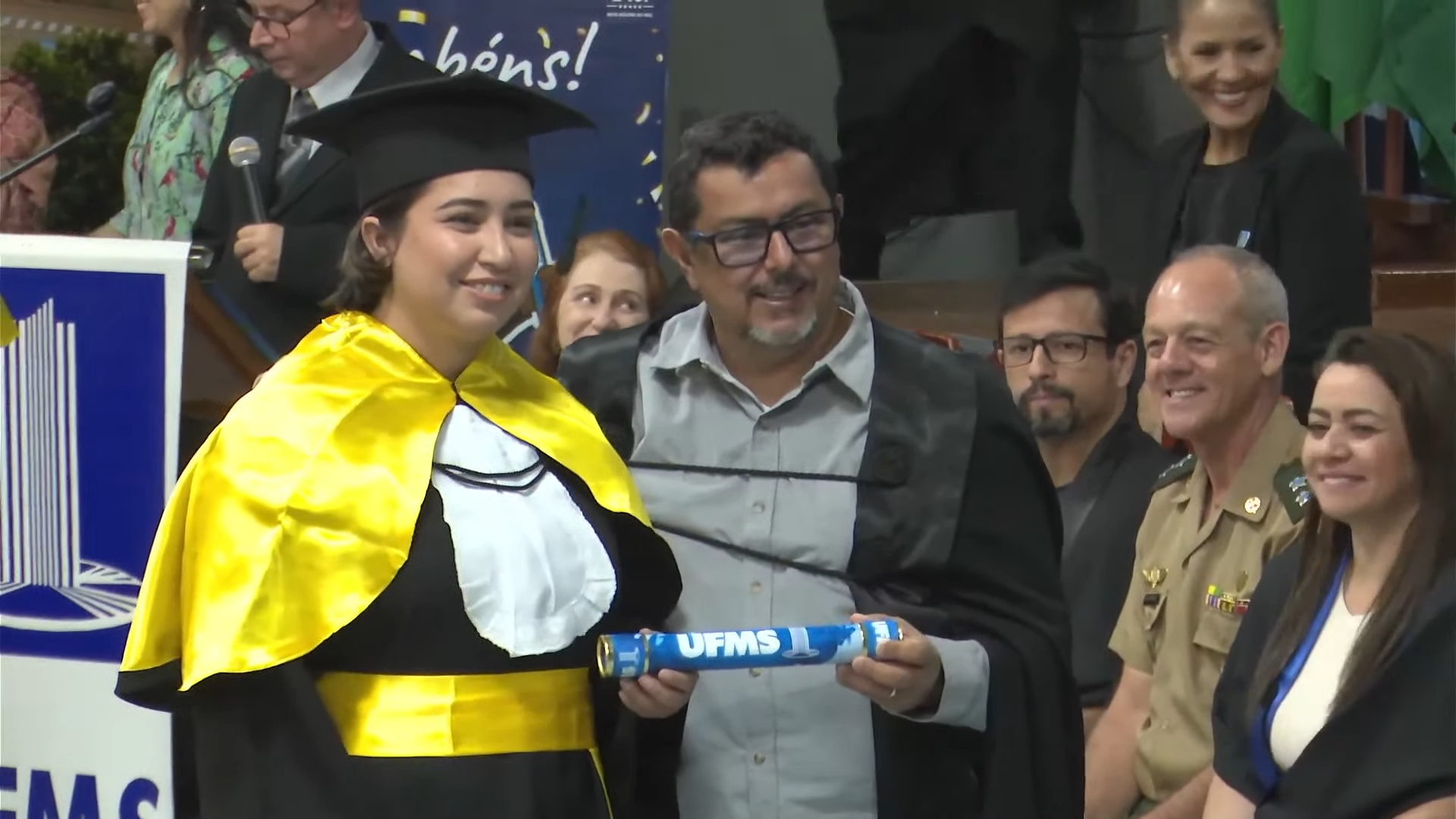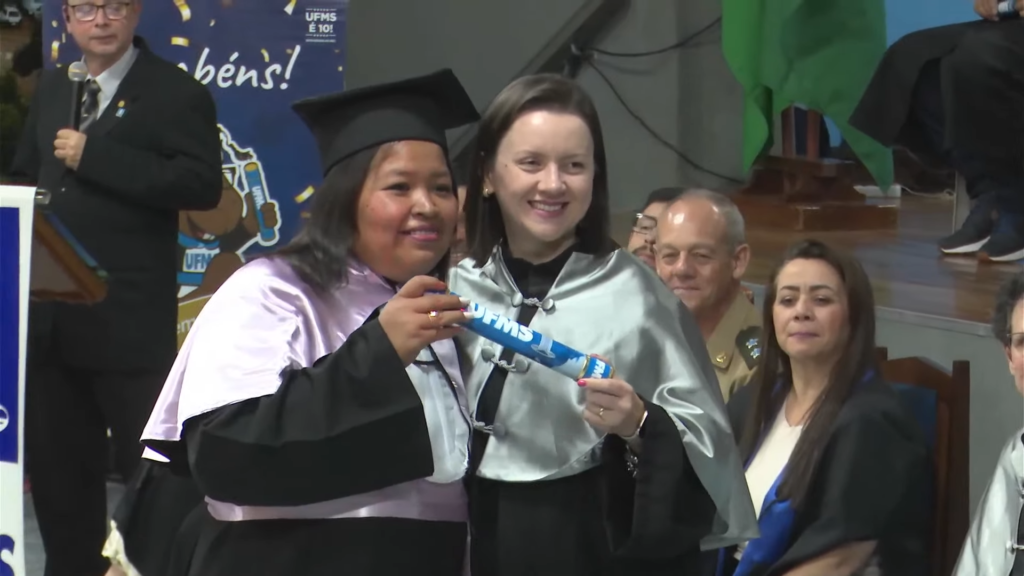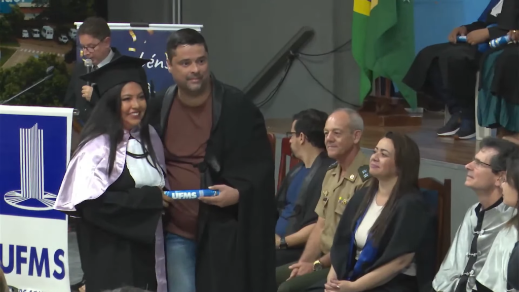 Representando seus colegas, a licenciada em História Mirela Aparecida de Souza emocionou os presentes com um discurso marcado por gratidão, fé e superação. “Eles [os profissionais da UFMS] nos ajudaram, alunos, a chegar até a graduação, oferecendo uma atenção especial, dando e recebendo cuidado, e nos ajudaram a chegar a esse momento vitorioso. Somos muito gratos pelo carinho e pela atenção com que fomos tratados. Dedico essa conquista ao meu esposo, aos meus filhos e também a um filho que já se foi. Ele foi um grande guerreiro e viveu até os 23 anos. Nossa caminhada foi incrível. Cada um de nós passou por momentos difíceis, mas também por risadas, rituais, dor, medo, rejeição, ansiedade e coragem. Mas, no fim, valeu a pena”, assegurou.