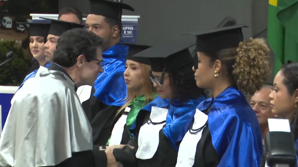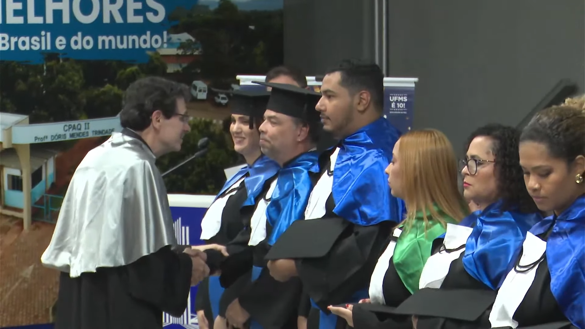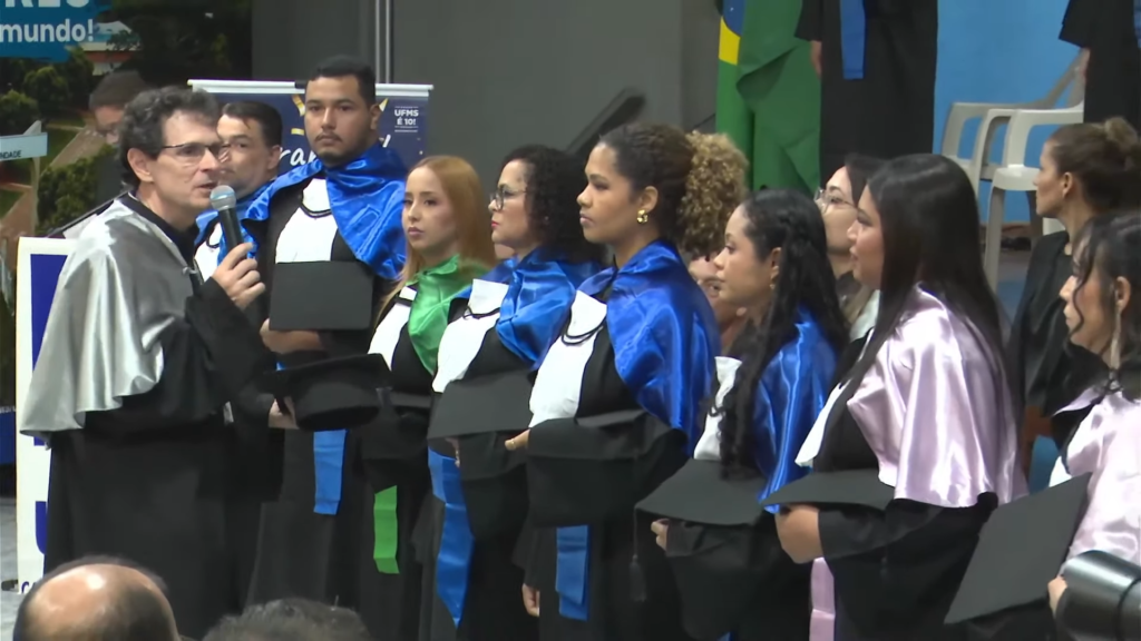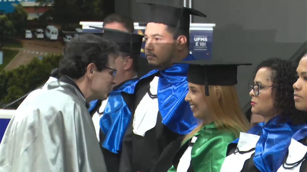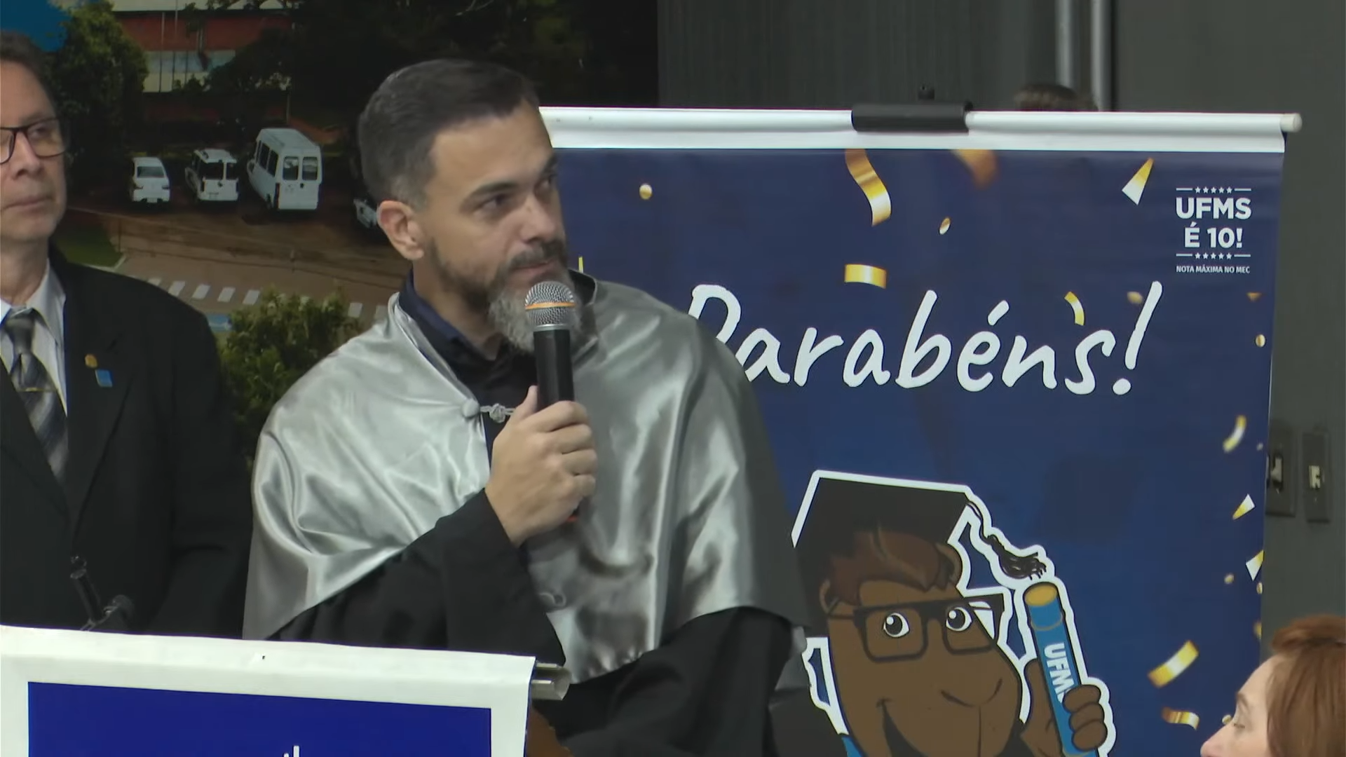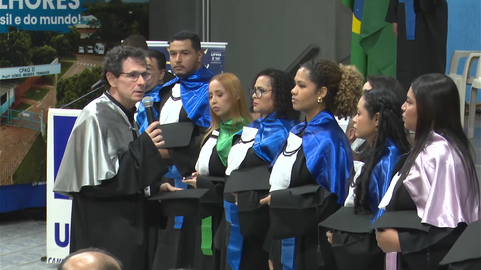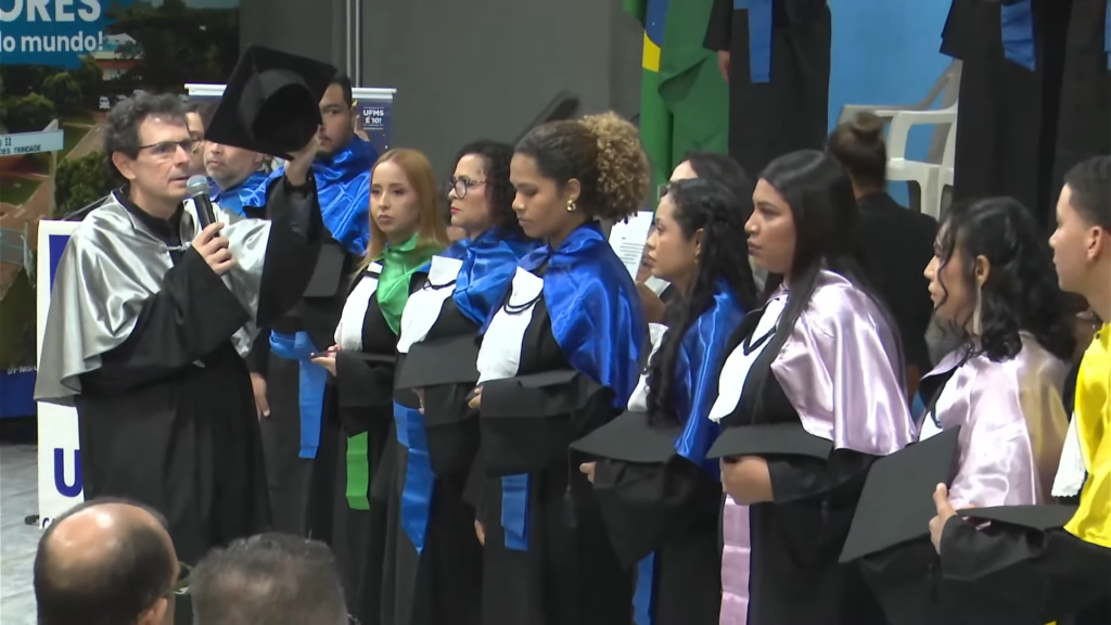 Presidindo a cerimônia, o vice-reitor Albert Schiaveto destacou o poder transformador do conhecimento. “Esta é a festa da educação da nossa Universidade Federal de Mato Grosso do Sul. É preciso uma aldeia inteira para educar uma criança. Vocês estão se formando e tenho certeza absoluta de que essa aldeia, composta por familiares, amigos, professores, servidores, fez parte da formação de cada um de vocês. A presença de todos vocês aqui hoje mostra exatamente isso”, ressaltou.